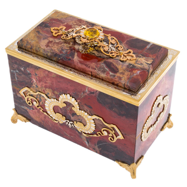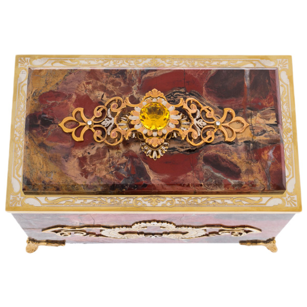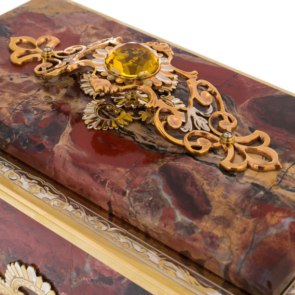 Special attention is drawn to the decorative design of the box, made in the traditional Zlatoust technique of engraving and hot enamel. Elegant bronze and gold elements with filigree patterns decorate the case and lid, creating a harmonious and solemn image. The central accent is a large citrine, a sunstone with a warm yellow hue, which gives the product a special expressiveness and symbolism of joy and vitality.
