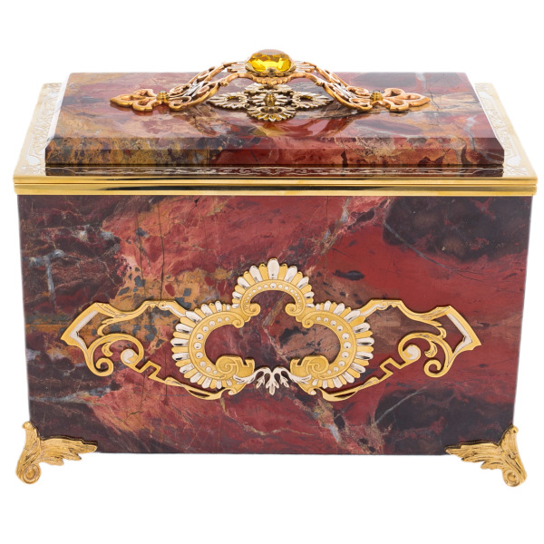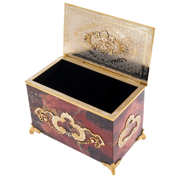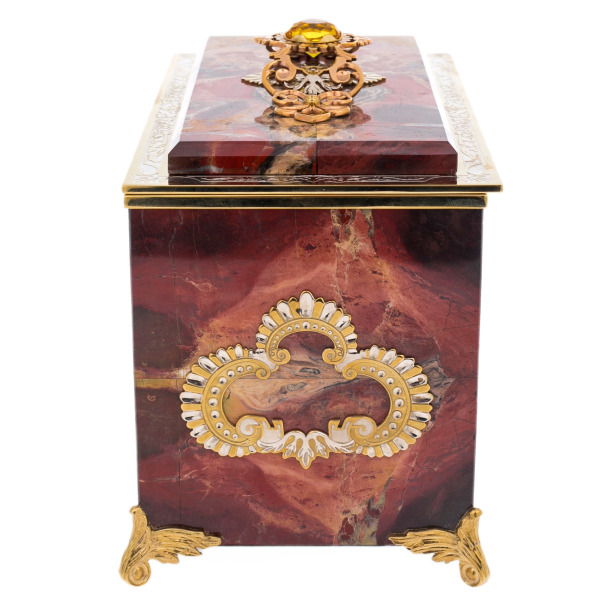 The Passion jasper casket is a magnificent combination of natural power and the grace of artistic decoration. Jasper with its deep saturated shades of red and brown creates the effect of a vibrant, dynamic texture, symbolizing passion and energy. The interior is made of soft black velvet, which carefully preserves jewelry and valuable small items, emphasizing the practicality and sophistication of the product.