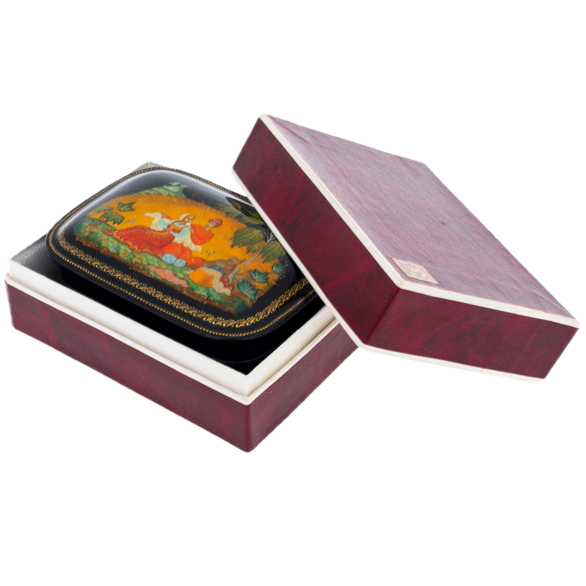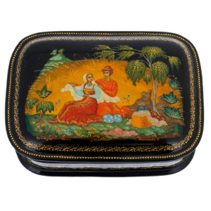Это произведение палехских мастеров, выполненное в технике традиционной лаковой миниатюры, изначально создававшейся для самых взыскательных ценителей русского искусства. Корпус шкатулки формируется из прочной папье-маше, проходящего многоступенчатую сушку и покрываемого глубоким чёрным лаком, создающим эффект бездонной глянцевой поверхности. Внутреннее пространство выстлано густым красным лаком, контрастирующим с тёмным внешним блеском и подчёркивающим ощущение камерной драгоценности.