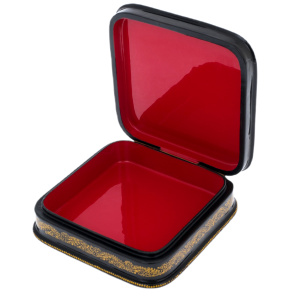 Это произведение палехских мастеров, выполненное в технике традиционной лаковой миниатюры, изначально создававшейся для самых взыскательных ценителей русского искусства. Корпус шкатулки формируется из прочной папье-маше, проходящего многоступенчатую сушку и покрываемого глубоким чёрным лаком, создающим эффект бездонной глянцевой поверхности. Внутреннее пространство выстлано густым красным лаком, контрастирующим с тёмным внешним блеском и подчёркивающим ощущение камерной драгоценности.