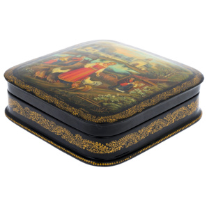 Вся поверхность украшена тончайшей ручной росписью, выполненной натуральными пигментами и золотом, растёртым до состояния мягкой светящейся пыли. Мастера, работающие над такими вещами, используют традиционные приёмы палехской школы — миниатюрные мазки, крошечные штрихи, многослойные прозрачные лессировки. Благодаря этому изображения приобретают характерную воздушность, глубину и узнаваемую по всему миру изящную декоративность. Золотой орнамент, обрамляющий композицию, создаётся особо тонкими кистями и требует безукоризненной точности движений.