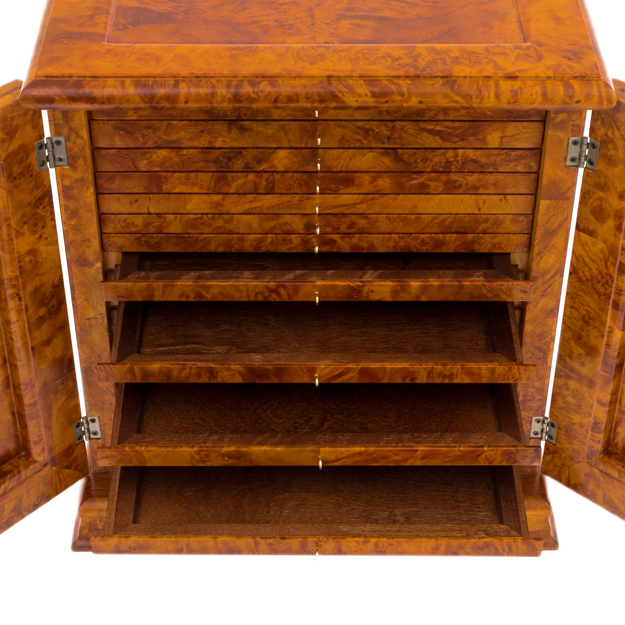 Шкатулка-шкафчик из карельской берёзы «Нумизмат» — это элегантное и практичное решение для хранения ценных коллекций, украшений или памятных мелочей. Изготовленная из редкой и ценной карельской берёзы, она отличается выразительным природным рисунком древесины, который придаёт изделию неповторимый шарм и благородство. Массивная конструкция с двумя дверцами и многочисленными выдвижными ящиками обеспечивает удобный и безопасный доступ к содержимому.