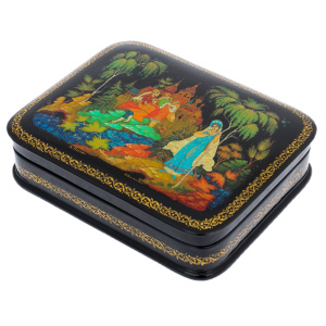 Вся поверхность украшена тончайшей ручной росписью, выполненной натуральными пигментами и золотом, растёртым до состояния мягкой светящейся пыли. Мастера, работающие над такими вещами, используют традиционные приёмы палехской школы — миниатюрные мазки, крошечные штрихи, многослойные прозрачные лессировки. Благодаря этому изображения приобретают характерную воздушность, глубину и узнаваемую по всему миру изящную декоративность. Золотой орнамент, обрамляющий композицию, создаётся особо тонкими кистями и требует безукоризненной точности движений.