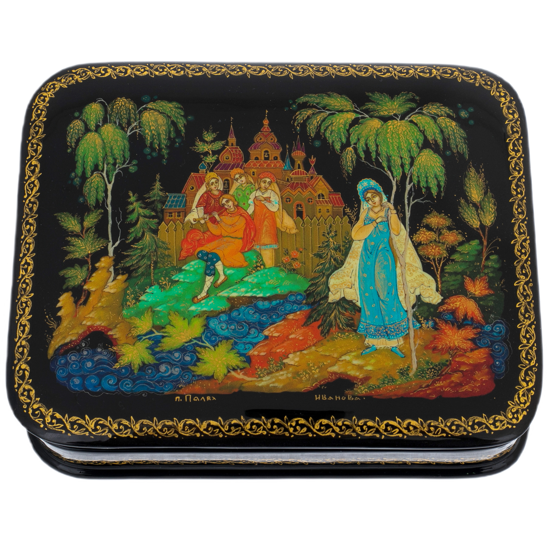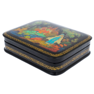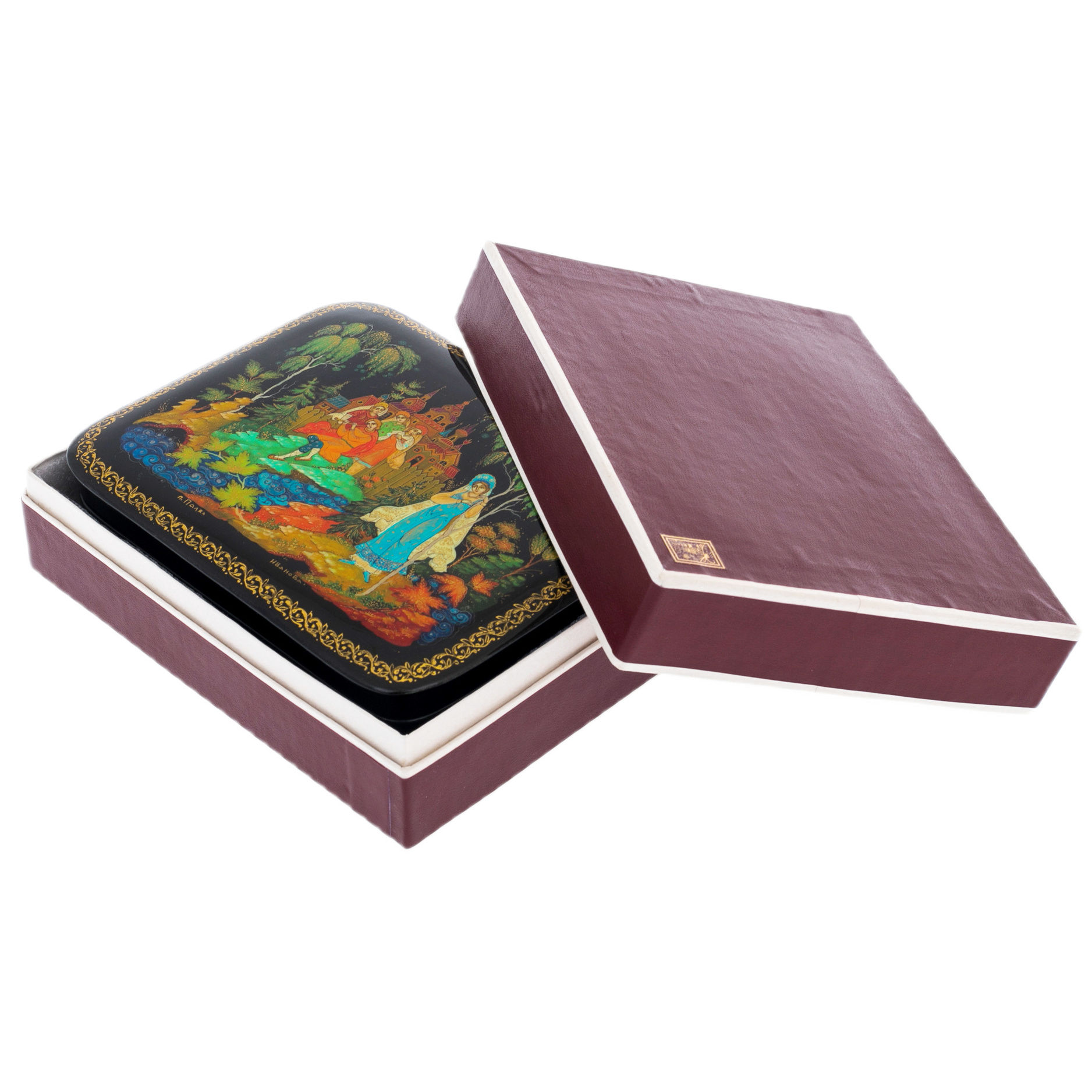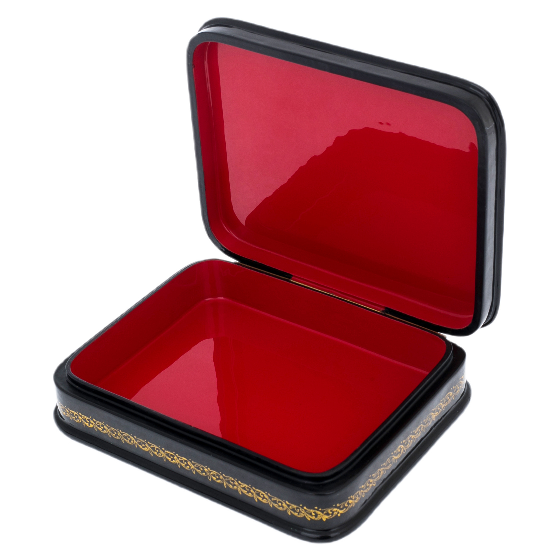 Это произведение палехских мастеров, выполненное в технике традиционной лаковой миниатюры, изначально создававшейся для самых взыскательных ценителей русского искусства. Корпус шкатулки формируется из прочной папье-маше, проходящего многоступенчатую сушку и покрываемого глубоким чёрным лаком, создающим эффект бездонной глянцевой поверхности. Внутреннее пространство выстлано густым красным лаком, контрастирующим с тёмным внешним блеском и подчёркивающим ощущение камерной драгоценности.