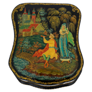 Это произведение палехских мастеров, выполненное в технике традиционной лаковой миниатюры, изначально создававшейся для самых взыскательных ценителей русского искусства. Корпус шкатулки формируется из прочной папье-маше, проходящего многоступенчатую сушку и покрываемого глубоким чёрным лаком, создающим эффект бездонной глянцевой поверхности. Внутреннее пространство выстлано густым красным лаком, контрастирующим с тёмным внешним блеском и подчёркивающим ощущение камерной драгоценности.