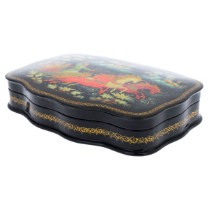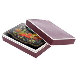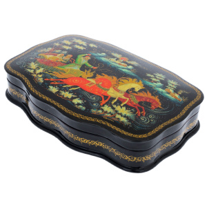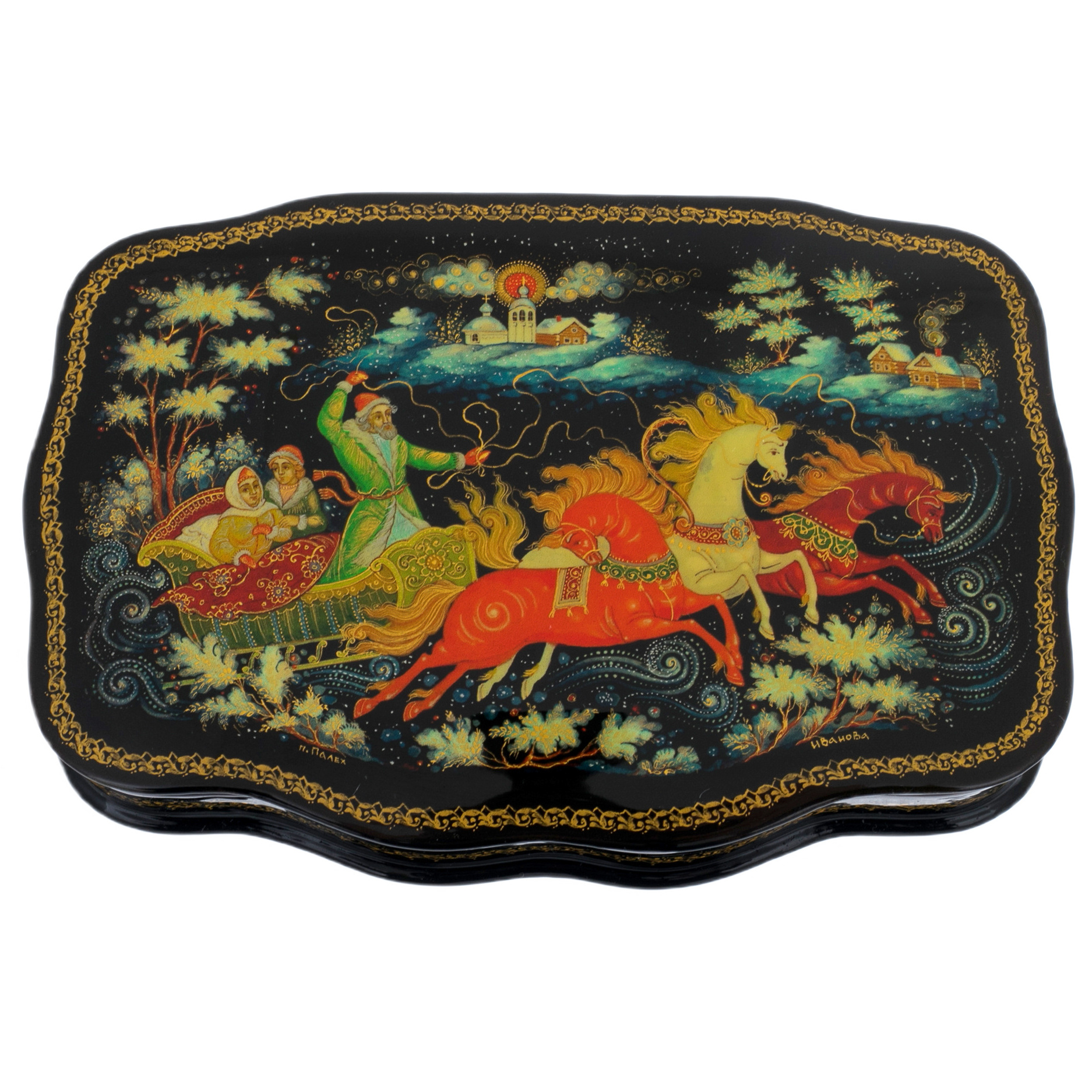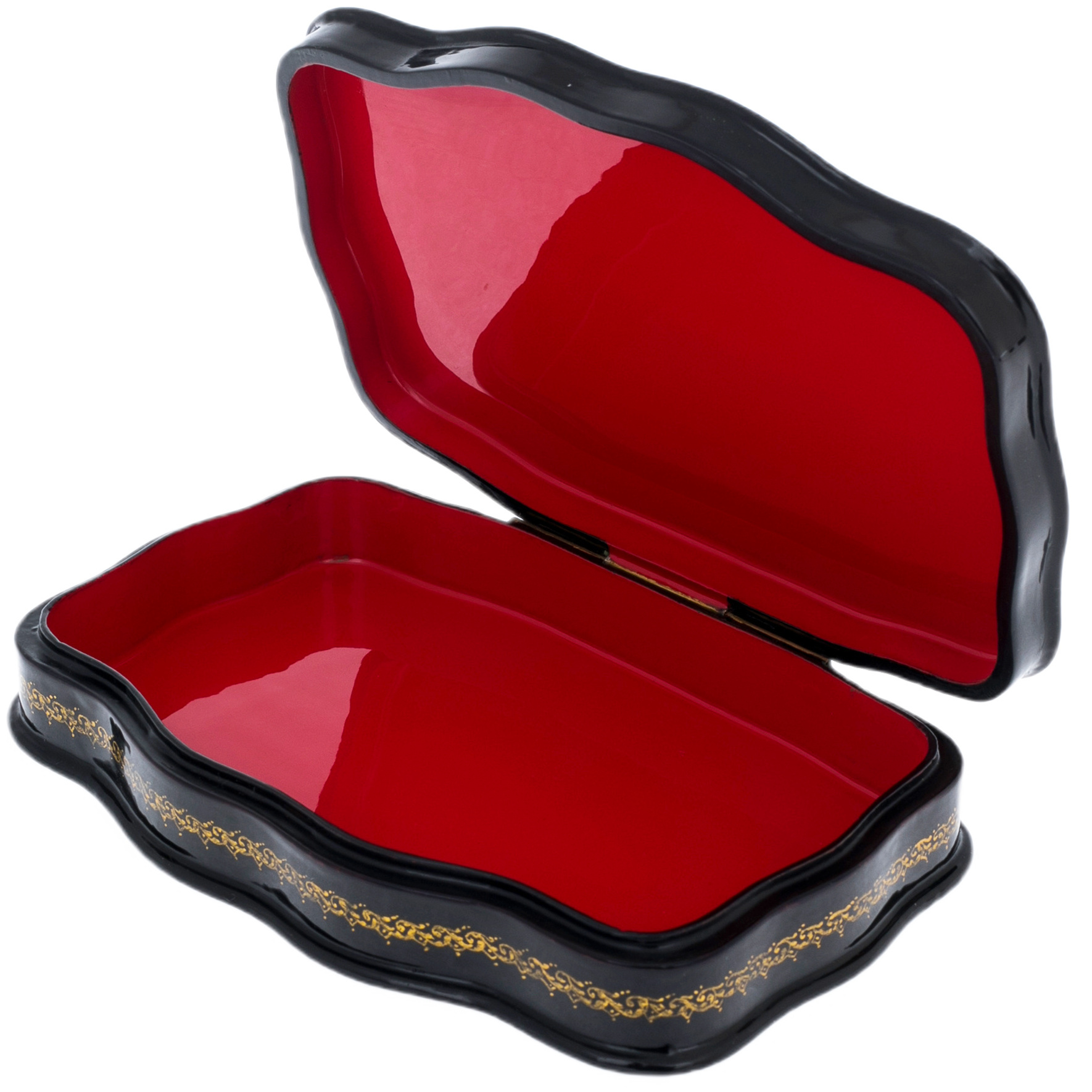 Это произведение палехских мастеров, выполненное в технике традиционной лаковой миниатюры, изначально создававшейся для самых взыскательных ценителей русского искусства. Корпус шкатулки формируется из прочной папье-маше, проходящего многоступенчатую сушку и покрываемого глубоким чёрным лаком, создающим эффект бездонной глянцевой поверхности. Внутреннее пространство выстлано густым красным лаком, контрастирующим с тёмным внешним блеском и подчёркивающим ощущение камерной драгоценности.