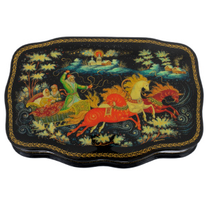 Вся поверхность украшена тончайшей ручной росписью, выполненной натуральными пигментами и золотом, растёртым до состояния мягкой светящейся пыли. Мастера, работающие над такими вещами, используют традиционные приёмы палехской школы — миниатюрные мазки, крошечные штрихи, многослойные прозрачные лессировки. Благодаря этому изображения приобретают характерную воздушность, глубину и узнаваемую по всему миру изящную декоративность. Золотой орнамент, обрамляющий композицию, создаётся особо тонкими кистями и требует безукоризненной точности движений.