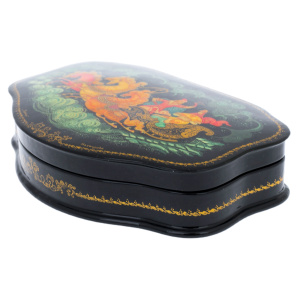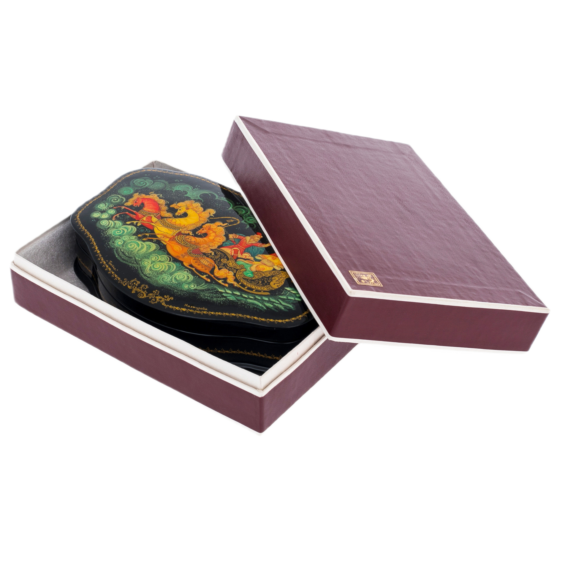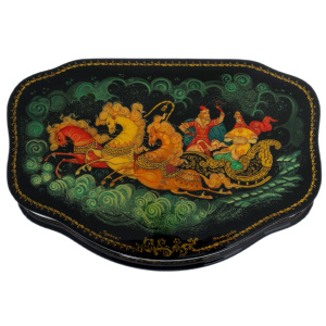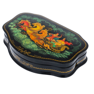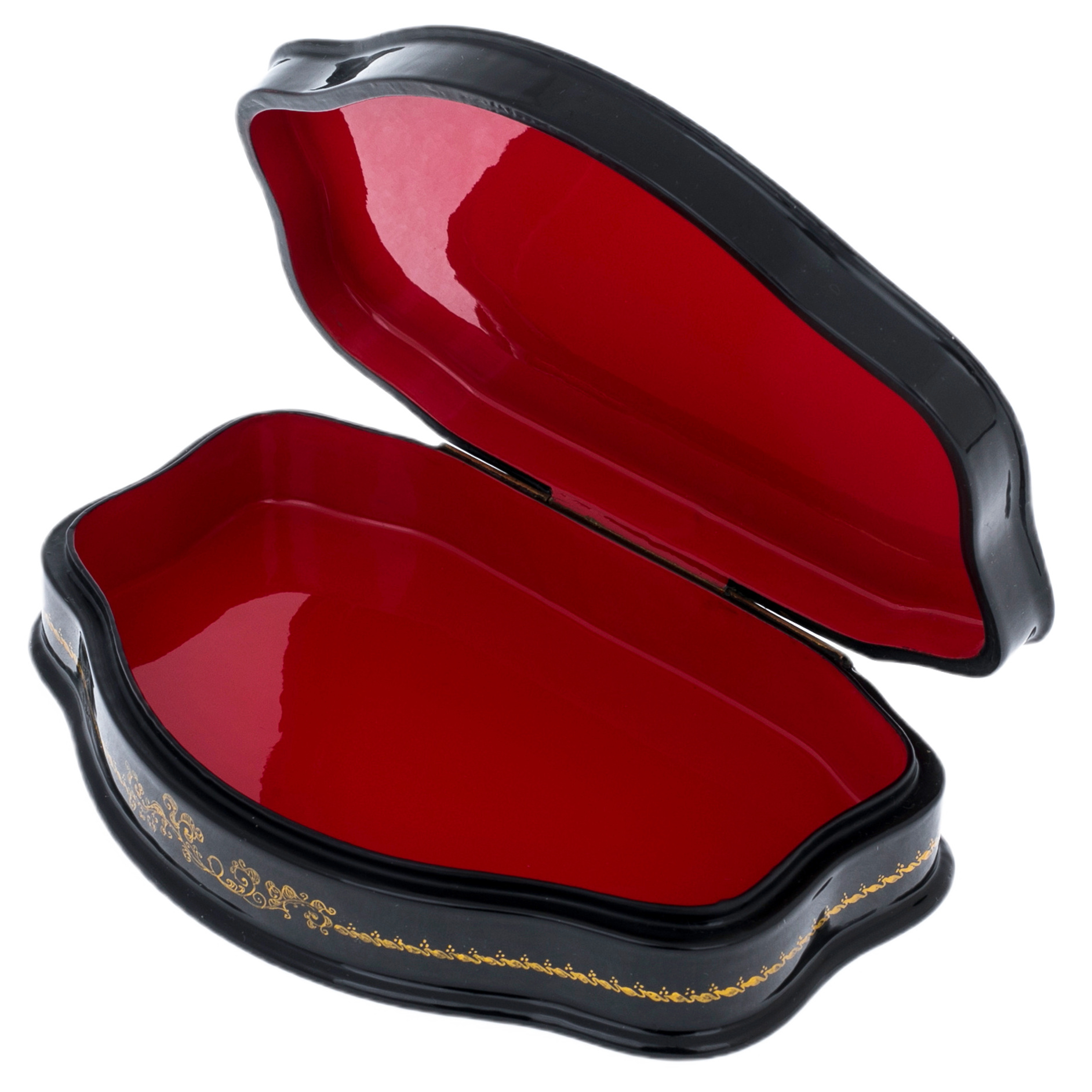 Это произведение палехских мастеров, выполненное в технике традиционной лаковой миниатюры, изначально создававшейся для самых взыскательных ценителей русского искусства. Корпус шкатулки формируется из прочной папье-маше, проходящего многоступенчатую сушку и покрываемого глубоким чёрным лаком, создающим эффект бездонной глянцевой поверхности. Внутреннее пространство выстлано густым красным лаком, контрастирующим с тёмным внешним блеском и подчёркивающим ощущение камерной драгоценности.