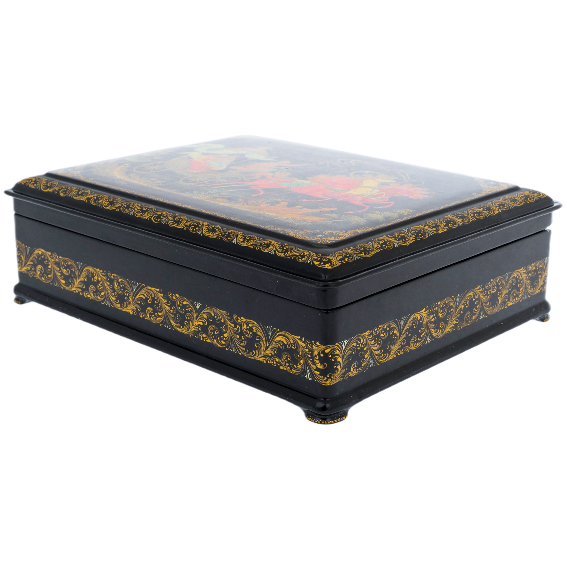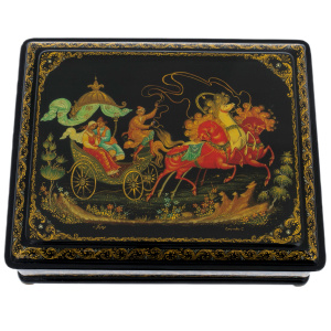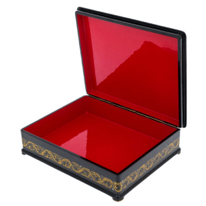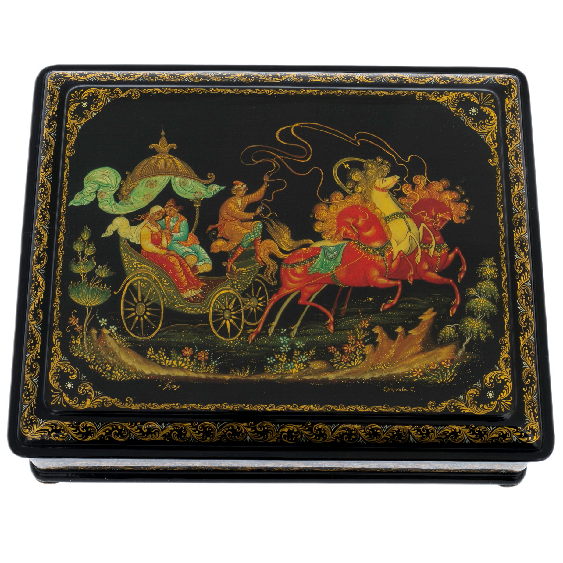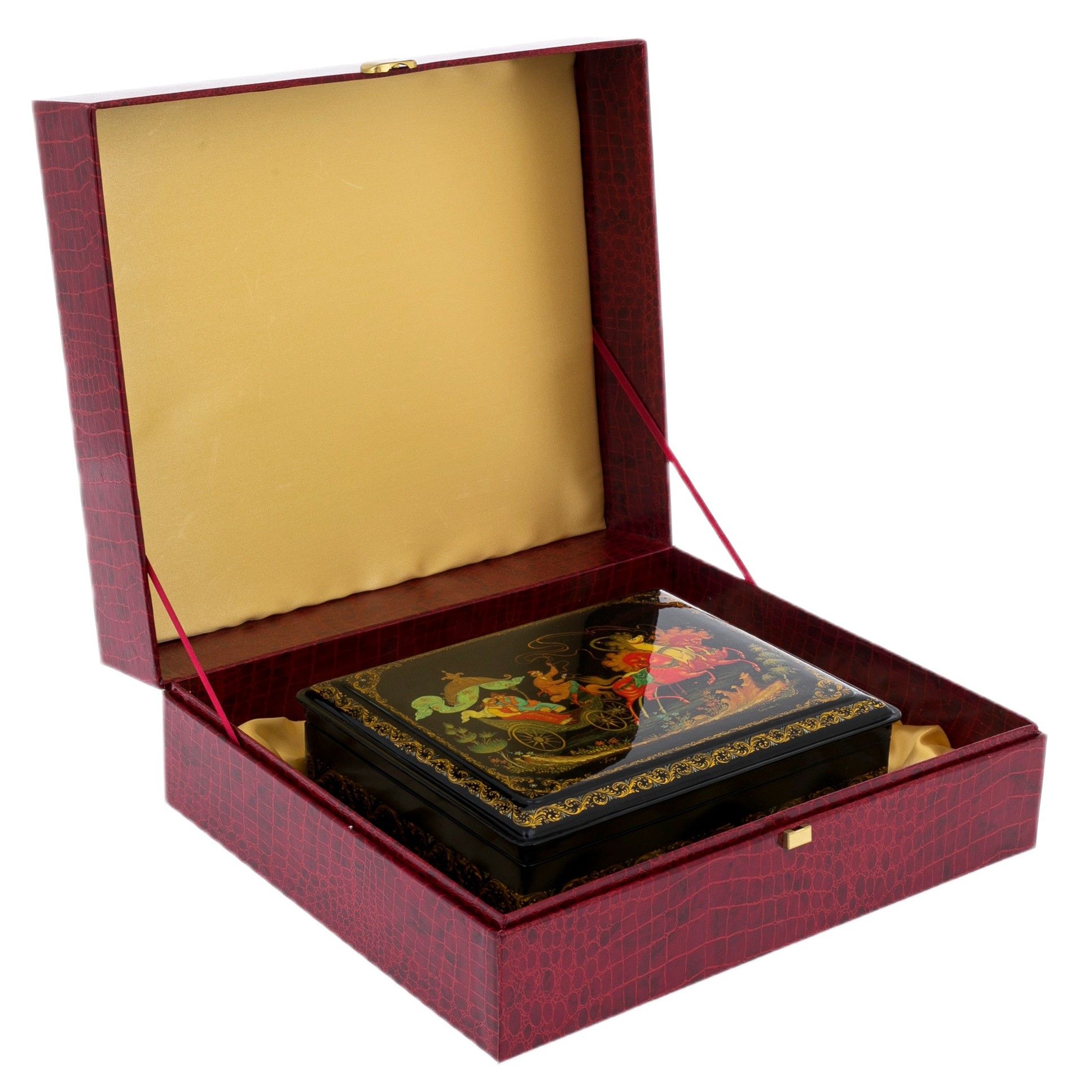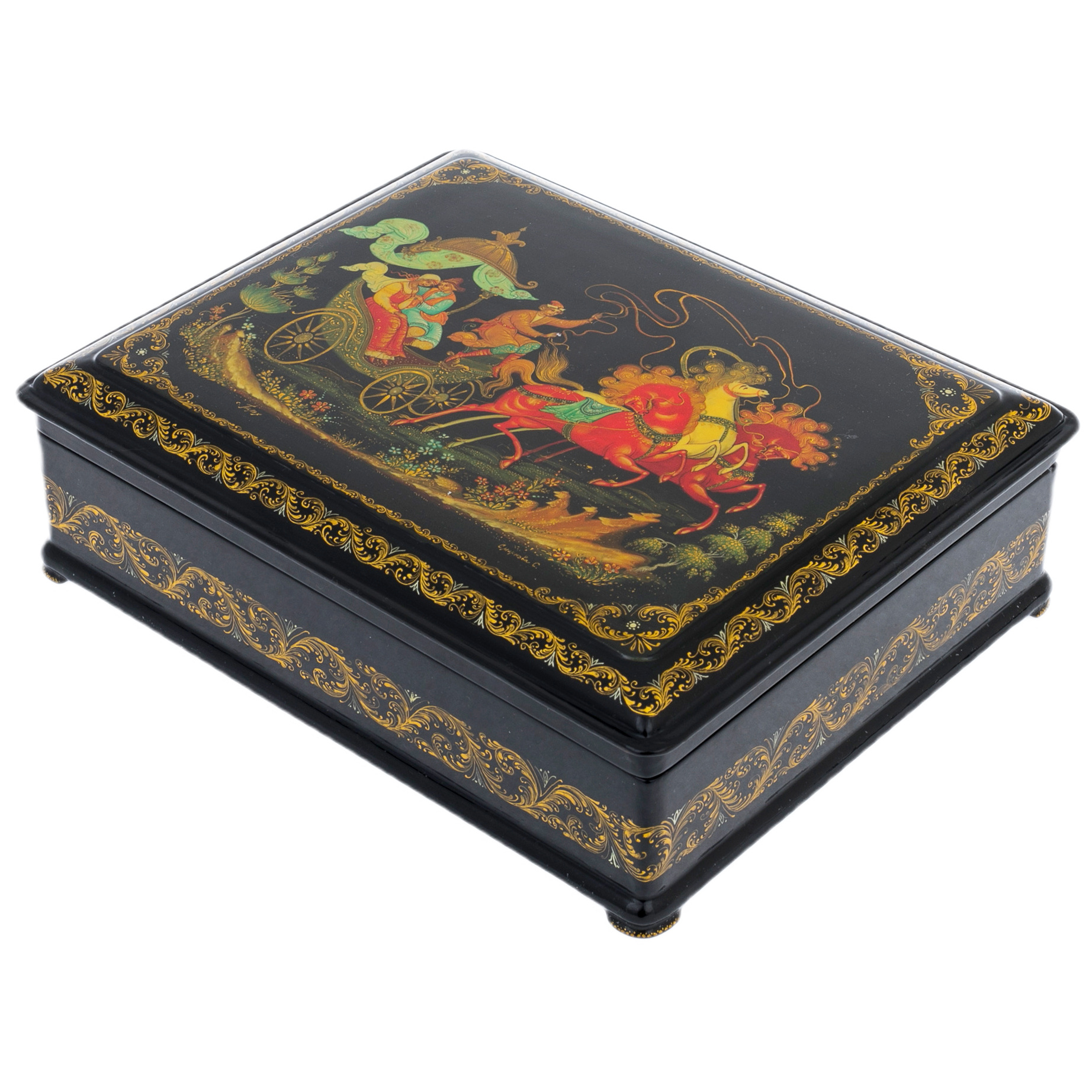 Это произведение палехских мастеров, выполненное в технике традиционной лаковой миниатюры, изначально создававшейся для самых взыскательных ценителей русского искусства. Корпус шкатулки формируется из прочной папье-маше, проходящего многоступенчатую сушку и покрываемого глубоким чёрным лаком, создающим эффект бездонной глянцевой поверхности. Внутреннее пространство выстлано густым красным лаком, контрастирующим с тёмным внешним блеском и подчёркивающим ощущение камерной драгоценности.