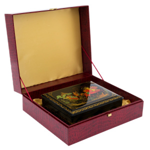 Вся поверхность украшена тончайшей ручной росписью, выполненной натуральными пигментами и золотом, растёртым до состояния мягкой светящейся пыли. Мастера, работающие над такими вещами, используют традиционные приёмы палехской школы — миниатюрные мазки, крошечные штрихи, многослойные прозрачные лессировки. Благодаря этому изображения приобретают характерную воздушность, глубину и узнаваемую по всему миру изящную декоративность. Золотой орнамент, обрамляющий композицию, создаётся особо тонкими кистями и требует безукоризненной точности движений.