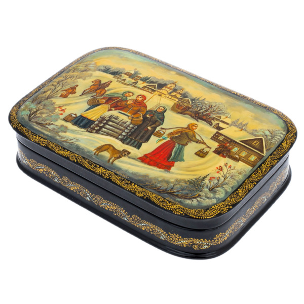 Вся поверхность украшена тончайшей ручной росписью, выполненной натуральными пигментами и золотом, растёртым до состояния мягкой светящейся пыли. Мастера, работающие над такими вещами, используют традиционные приёмы палехской школы — миниатюрные мазки, крошечные штрихи, многослойные прозрачные лессировки. Благодаря этому изображения приобретают характерную воздушность, глубину и узнаваемую по всему миру изящную декоративность. Золотой орнамент, обрамляющий композицию, создаётся особо тонкими кистями и требует безукоризненной точности движений.