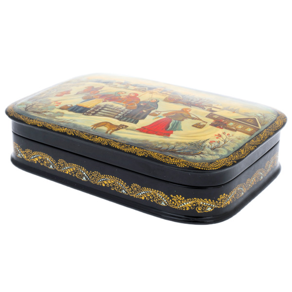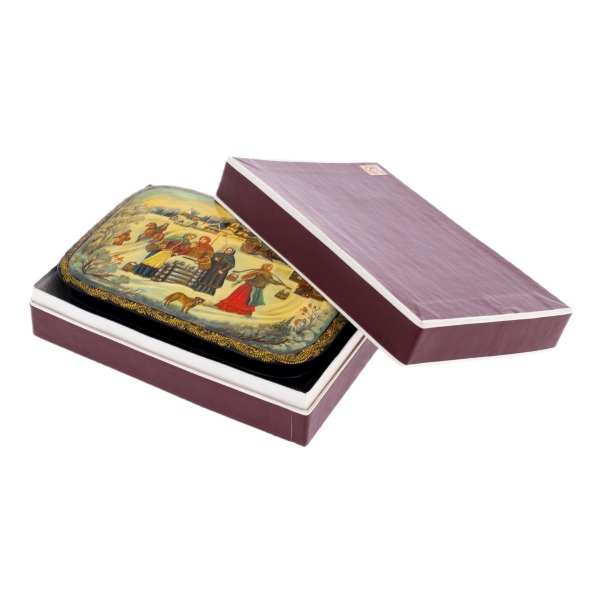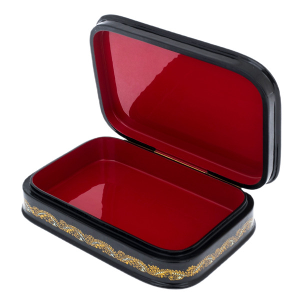 Это произведение палехских мастеров, выполненное в технике традиционной лаковой миниатюры, изначально создававшейся для самых взыскательных ценителей русского искусства. Корпус шкатулки формируется из прочной папье-маше, проходящего многоступенчатую сушку и покрываемого глубоким чёрным лаком, создающим эффект бездонной глянцевой поверхности. Внутреннее пространство выстлано густым красным лаком, контрастирующим с тёмным внешним блеском и подчёркивающим ощущение камерной драгоценности.
