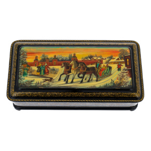 Вся поверхность украшена тончайшей ручной росписью, выполненной натуральными пигментами и золотом, растёртым до состояния мягкой светящейся пыли. Мастера, работающие над такими вещами, используют традиционные приёмы палехской школы — миниатюрные мазки, крошечные штрихи, многослойные прозрачные лессировки. Благодаря этому изображения приобретают характерную воздушность, глубину и узнаваемую по всему миру изящную декоративность. Золотой орнамент, обрамляющий композицию, создаётся особо тонкими кистями и требует безукоризненной точности движений.