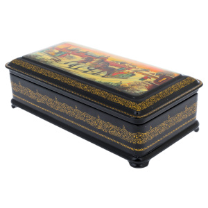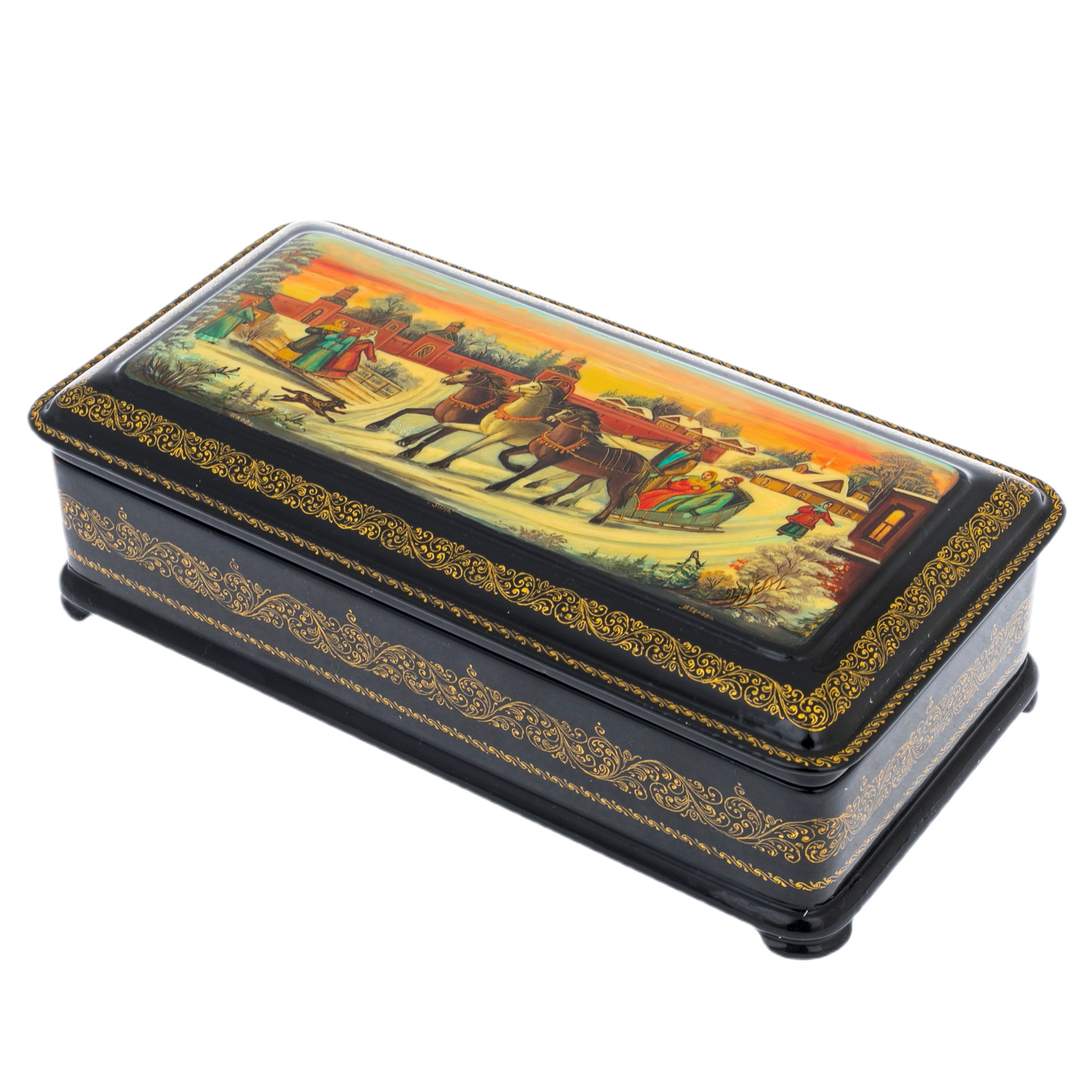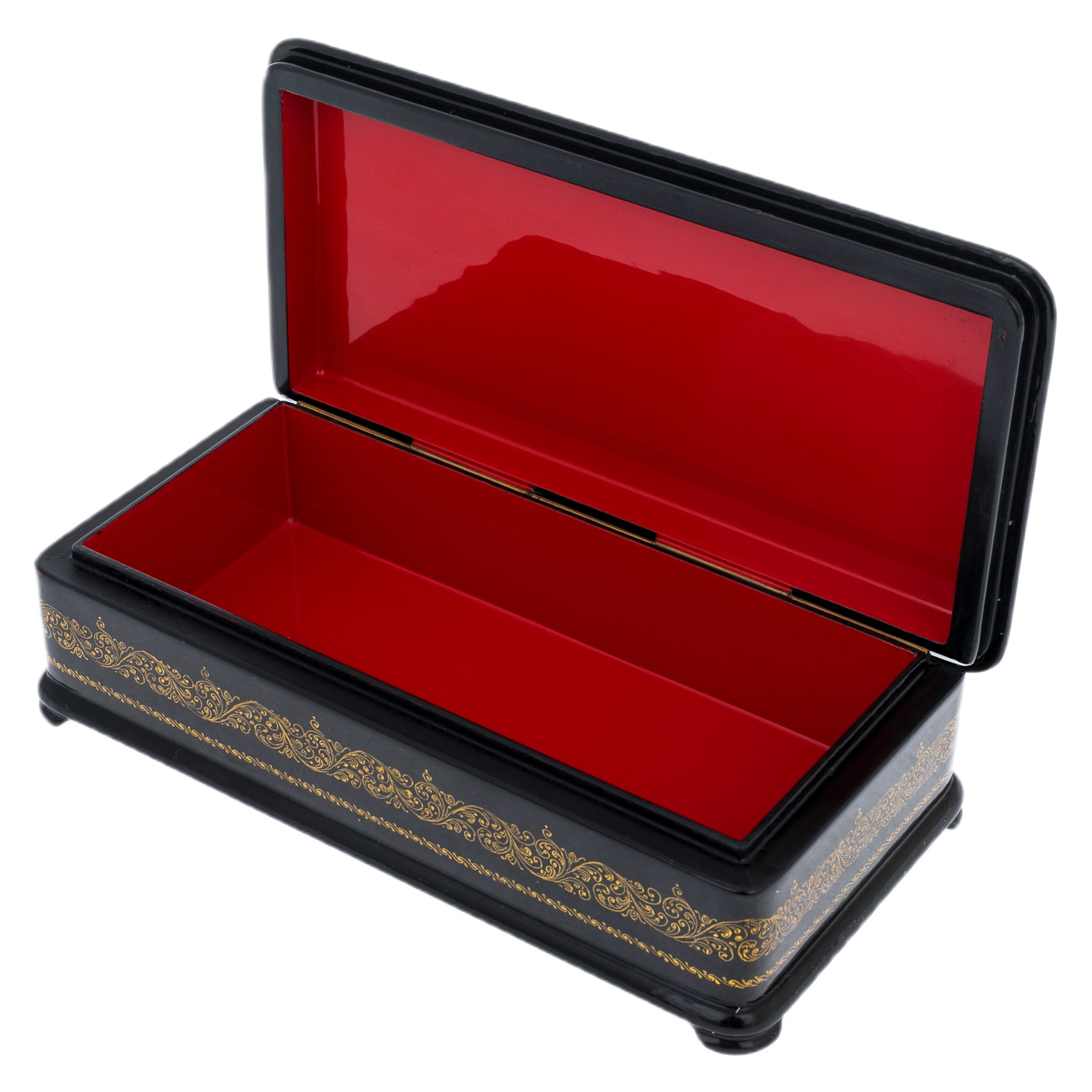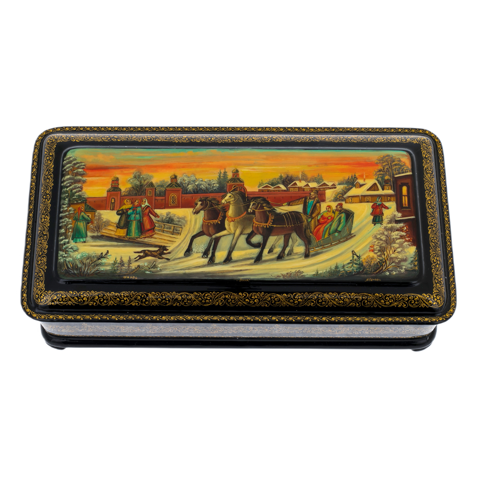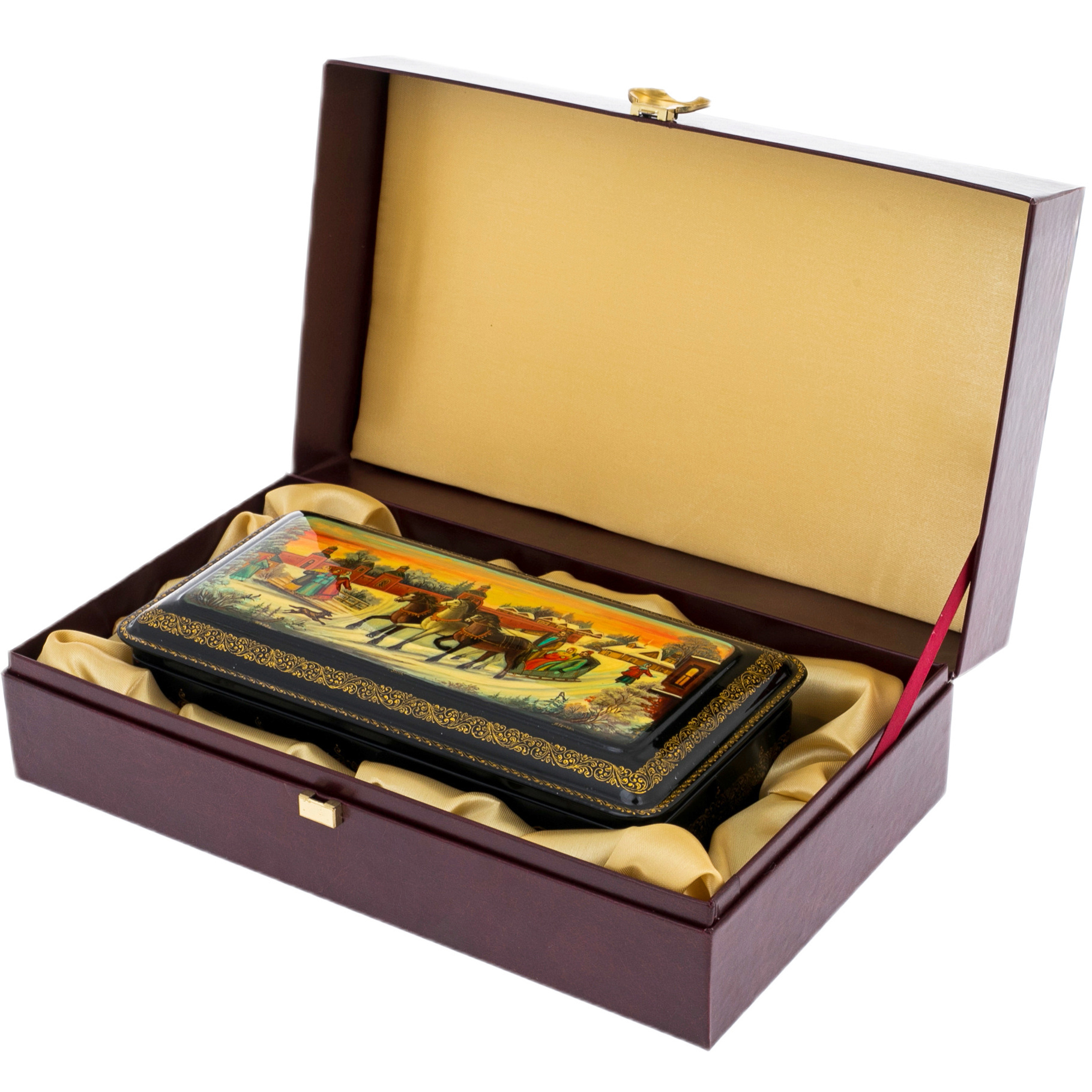Это произведение палехских мастеров, выполненное в технике традиционной лаковой миниатюры, изначально создававшейся для самых взыскательных ценителей русского искусства. Корпус шкатулки формируется из прочной папье-маше, проходящего многоступенчатую сушку и покрываемого глубоким чёрным лаком, создающим эффект бездонной глянцевой поверхности. Внутреннее пространство выстлано густым красным лаком, контрастирующим с тёмным внешним блеском и подчёркивающим ощущение камерной драгоценности.