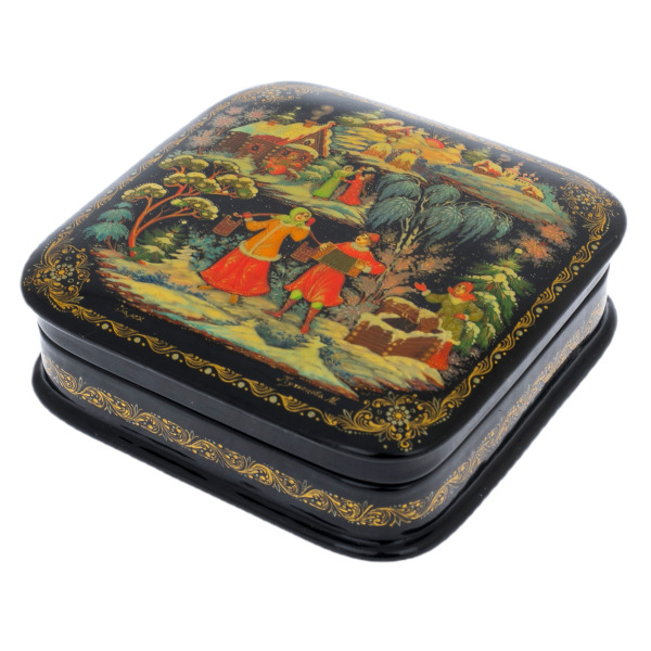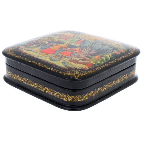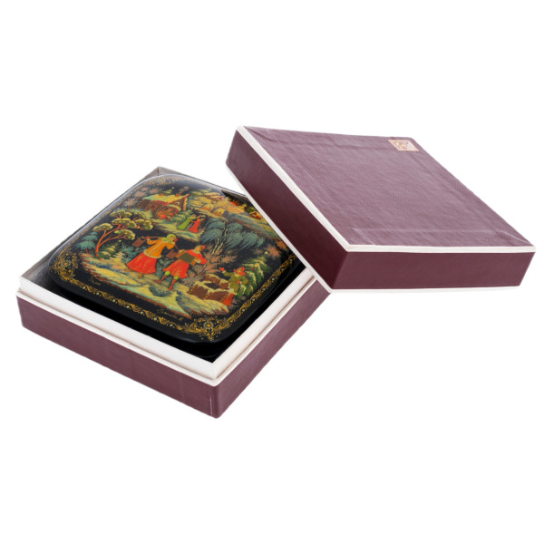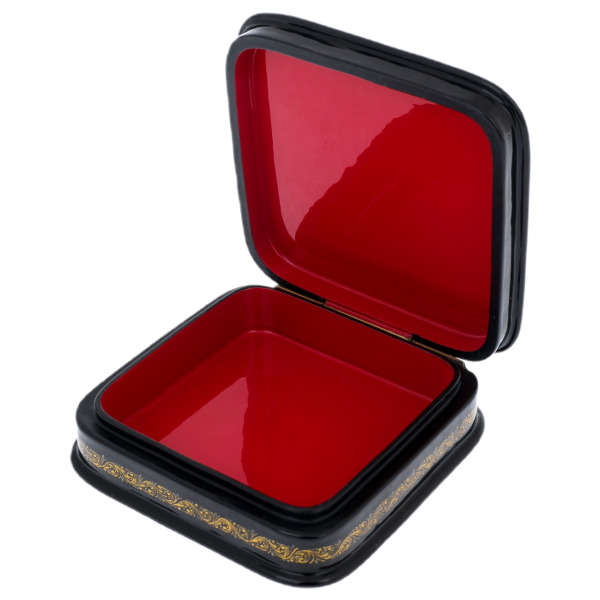 Это произведение палехских мастеров, выполненное в технике традиционной лаковой миниатюры, изначально создававшейся для самых взыскательных ценителей русского искусства. Корпус шкатулки формируется из прочной папье-маше, проходящего многоступенчатую сушку и покрываемого глубоким чёрным лаком, создающим эффект бездонной глянцевой поверхности. Внутреннее пространство выстлано густым красным лаком, контрастирующим с тёмным внешним блеском и подчёркивающим ощущение камерной драгоценности.