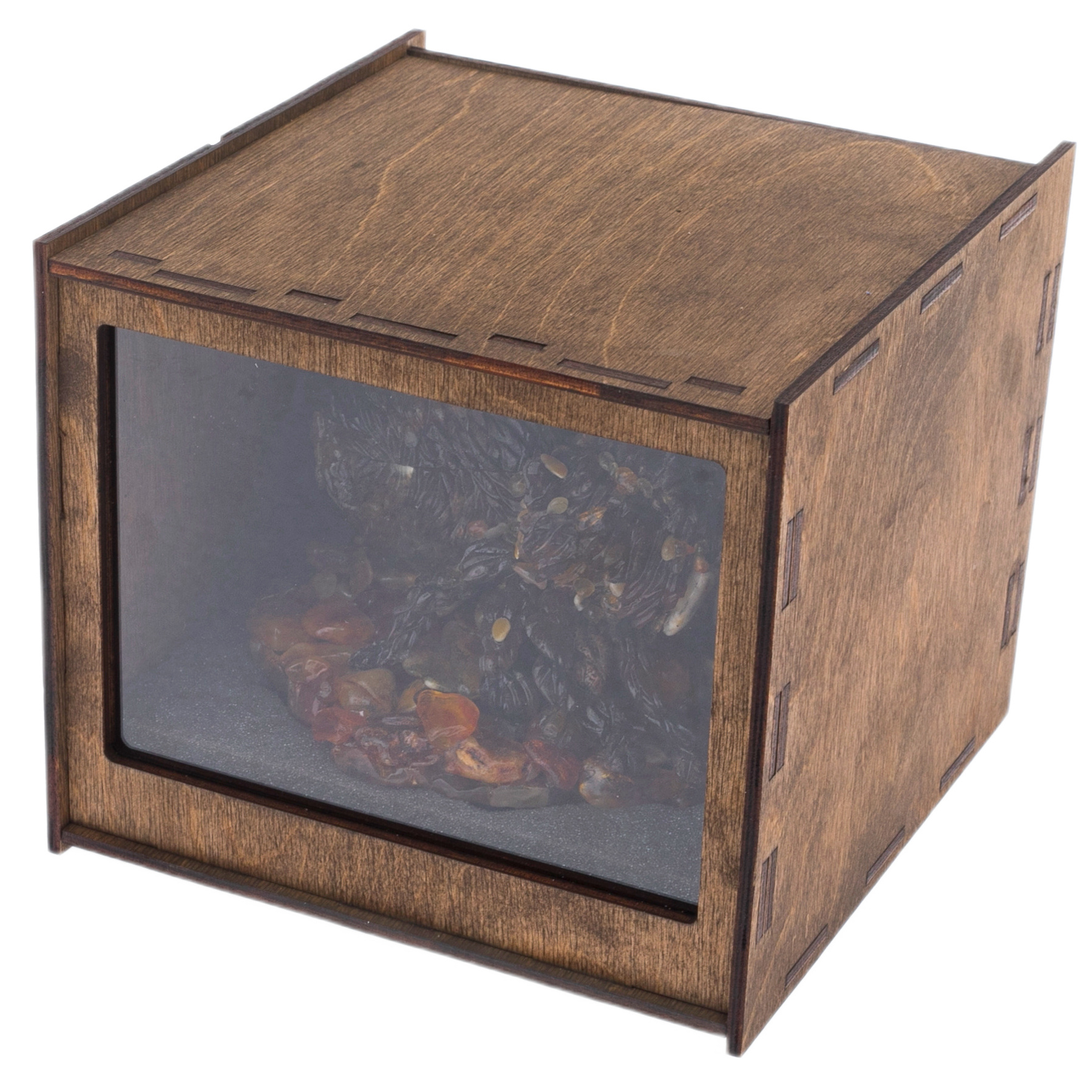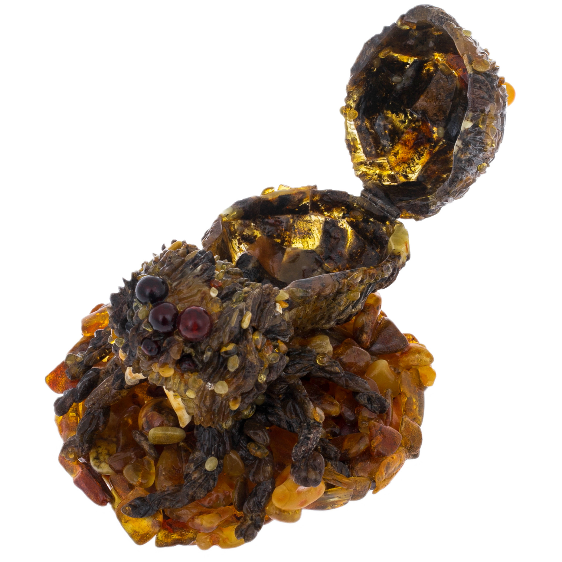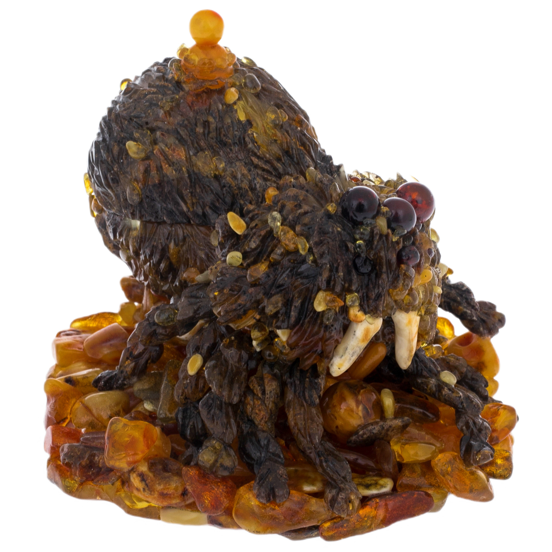 This amber casket is an exquisite art object that embodies the power of nature and a symbol of secret power. The spider's massive body is made of many amber fragments, as if growing from the depths of the earth, and is saturated with shades from honey to deep brown. Scarlet granules sparkle in the insect's eyes, reminiscent of the unexplored depths of the world's oceans, where amber originated millions of years ago. Executed with frightening realism, they seem to follow every movement, awakening a sense of hidden power.