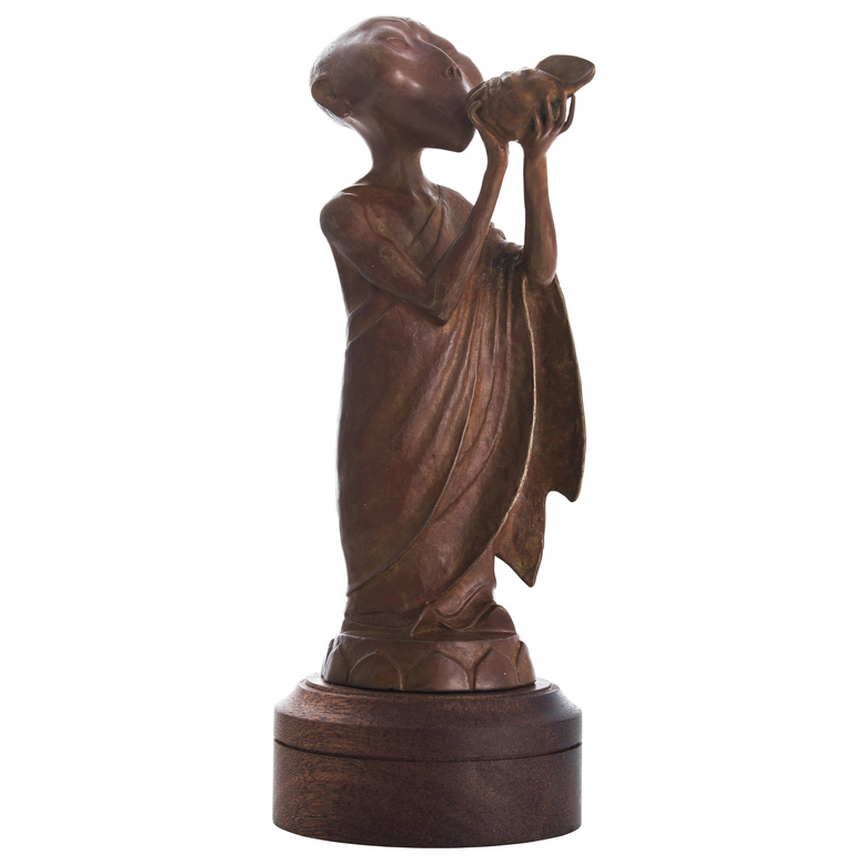 Автор лепит аскетичную фигуру мальчика-монаха, служащего в буддийском храме-дацане. Он дует в морскую раковину, которая издает грустный протяжный звук в определенных ритуалах.