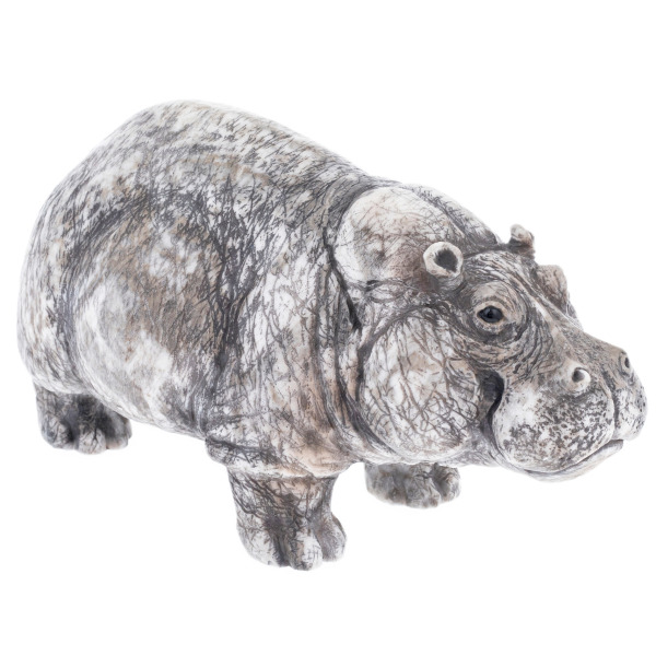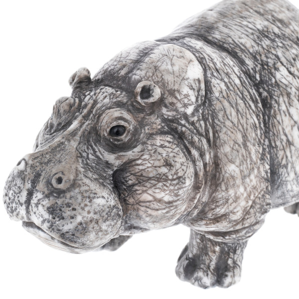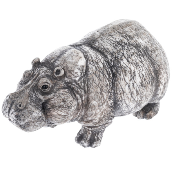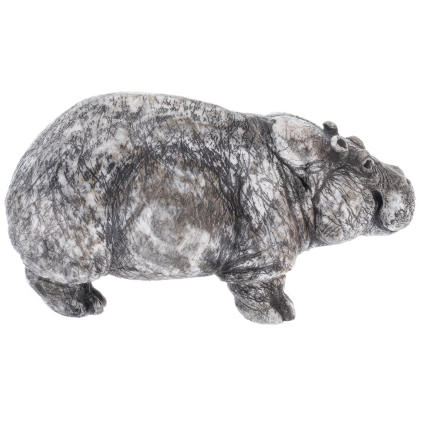 The material is natural calcite with a unique pattern: a grayish-white background, dotted with dark veins, reminiscent of reflections of trees on the water surface. This stone texture seems to capture the African twilight, the humid air of the river, the stillness and density of a tropical day. The polished surface gently reflects the light, emphasizing the volume and depth of the figure. The muzzle is especially expressive — with characteristic folds, asymmetry and a half-smile, in which the wise laziness of a seasoned giant is read.