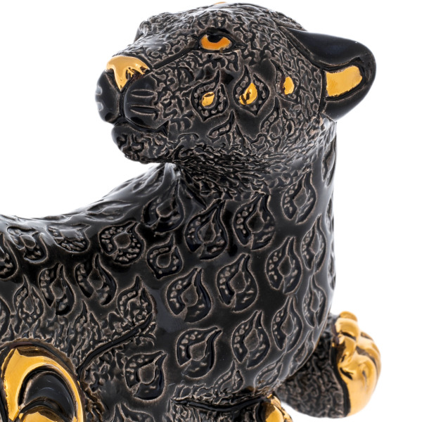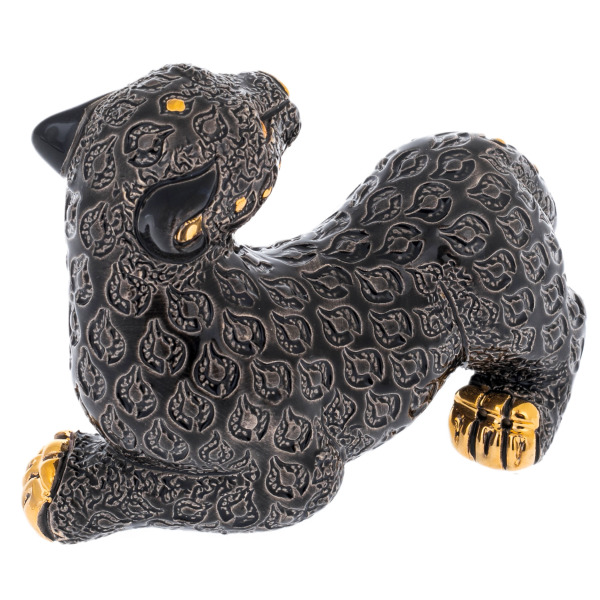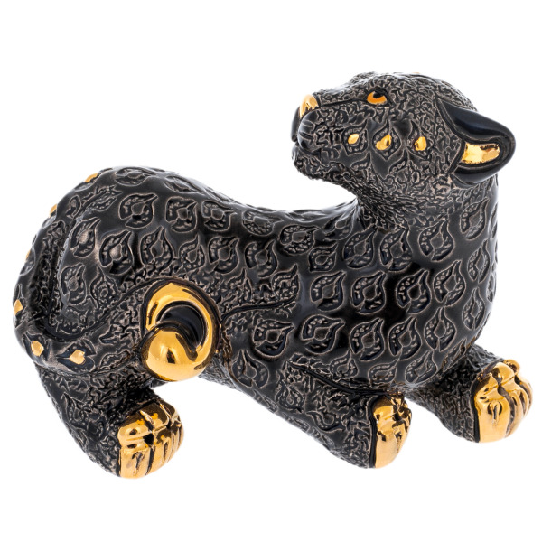 The matte surface is decorated with textured ornaments reminiscent of wild wool patterns, and the soft sheen of the black coating is set off by bright gilt accents on the ears, paws and eyes. Every detail is carefully worked out — from the smooth curves of the body to the expressive turn of the head, in which natural alertness and inner power are felt.