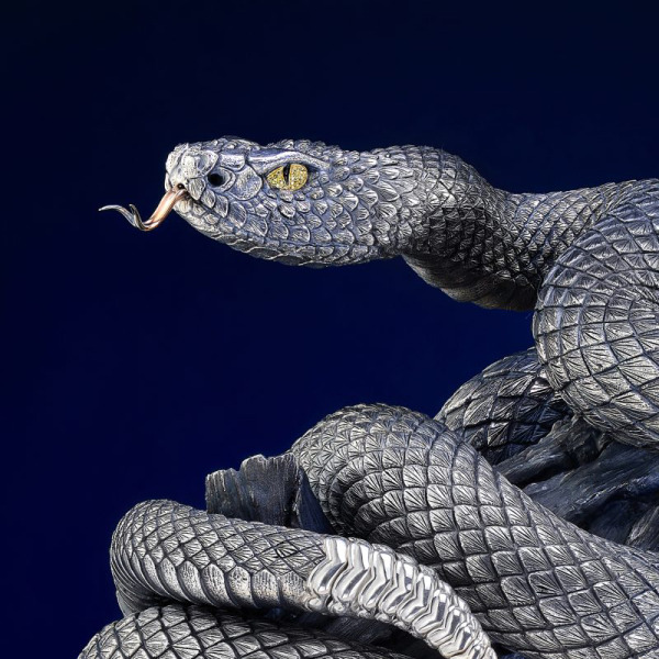 The silver statuette "Snake" is the embodiment of ancient wisdom, hidden power and grace, frozen in flawless metal. Made by hand with a filigree elaboration of each scale, it fascinates with the dynamics of movement and the hypnotic plasticity of the bending body. The look of predatory narrowed eyes, wary, but at the same time unperturbed, emphasizes the charisma of this symbolic creature.