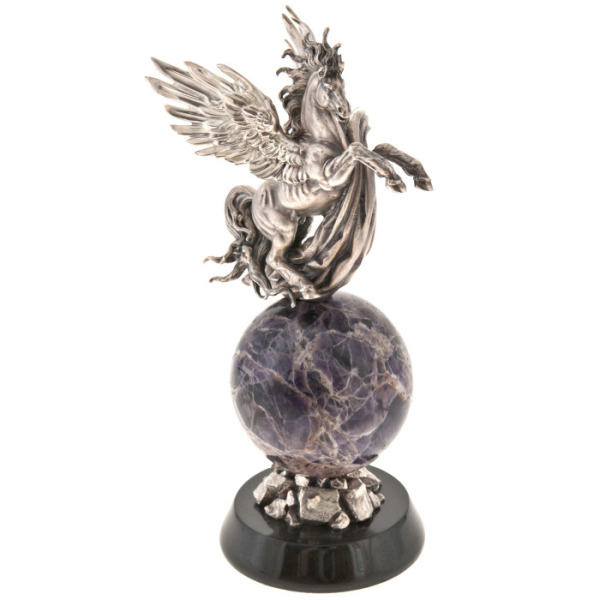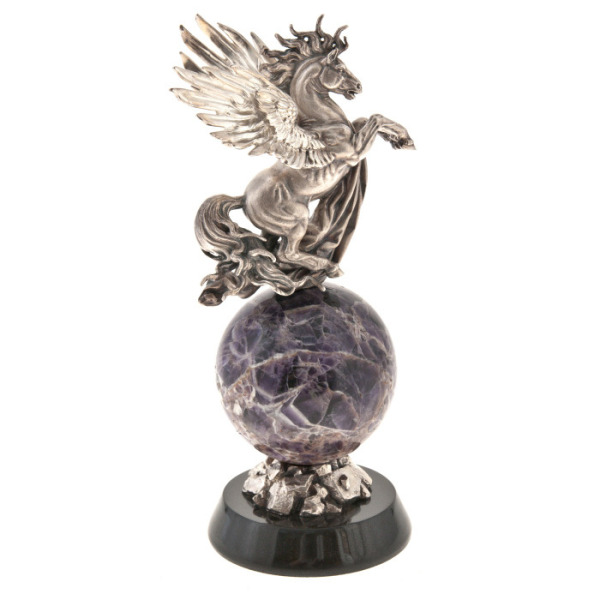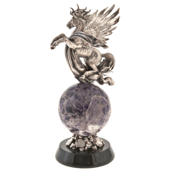 Amethyst, which serves as the base for the ball under the hooves of Pegasus, is known for its sedative properties and the ability to improve intellectual work, and is also a symbol of divine wisdom. The basalt base gives the composition firmness and stability, as well as contrast with the shiny bronze and deep color of the amethyst, creating an impressive sight.