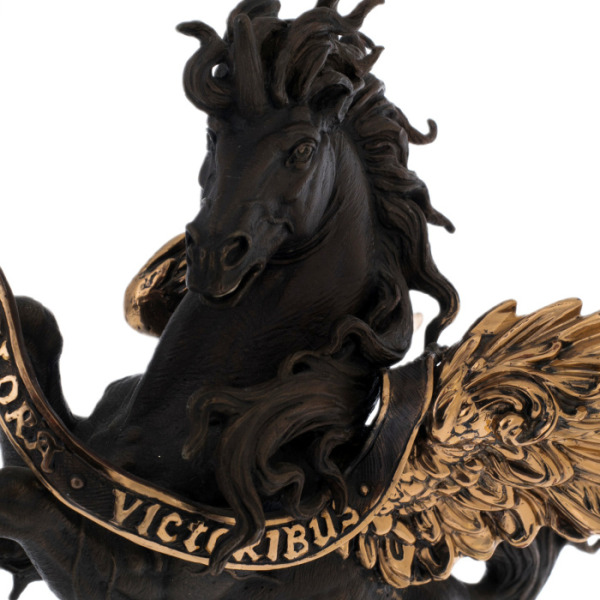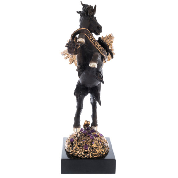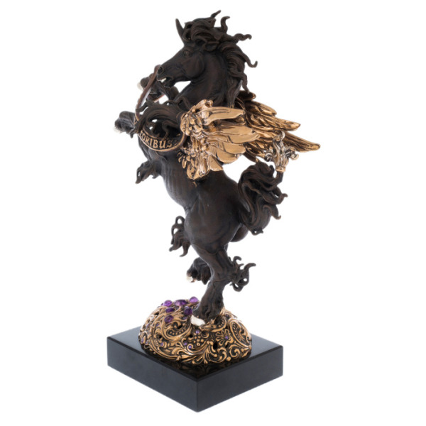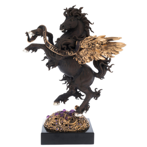 The sculptor depicted Pegasus as cheerful and briskly prancing on the golden meadows of Parnassus, dotted with placers of amethysts, with the motto "Gloria victoribus" fluttering in the wind, which means Glory to the winners. And since Pegasus is considered a symbol of success and inspiration, it brings good luck and success to the favorites of the gods. The sculpture is made of bronze using the technique of expensive vacuum casting inlaid with amethysts. Pegasus is an ancient symbol present in the heraldry of many royal houses of Europe. The elegant Pegasus was chosen as an emblem by the Templars. He symbolized glory, eloquence and contemplation. One of the constellations in the firmament is called the constellation of Pegasus.