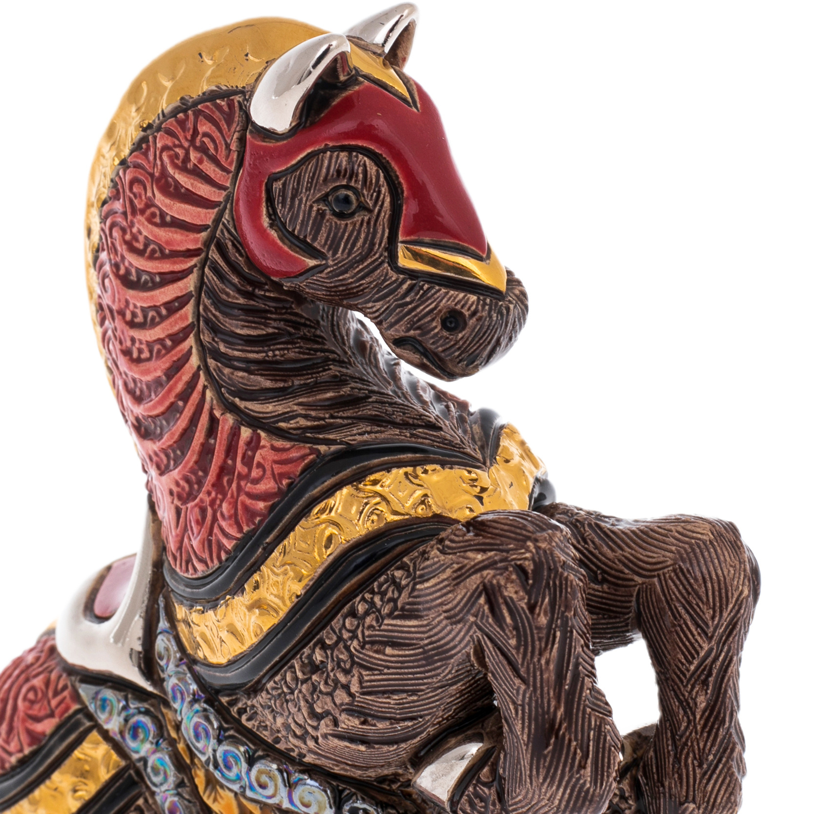 Керамика как материал позволяет достичь изысканного сочетания прочности и художественной выразительности. Ручная работа придаёт каждой детали живость и характер — ни один экземпляр не повторяет другой буквально. Особое внимание уделено драпировке попоны: она ложится мягкими складками, подчёркивая гордую стать животного и создавая живописный контраст с гладкостью корпуса. Обжиг при высокой температуре обеспечивает долговечность и стойкость покрытия, позволяя сохранять насыщенность цвета и целостность формы на протяжении многих лет.