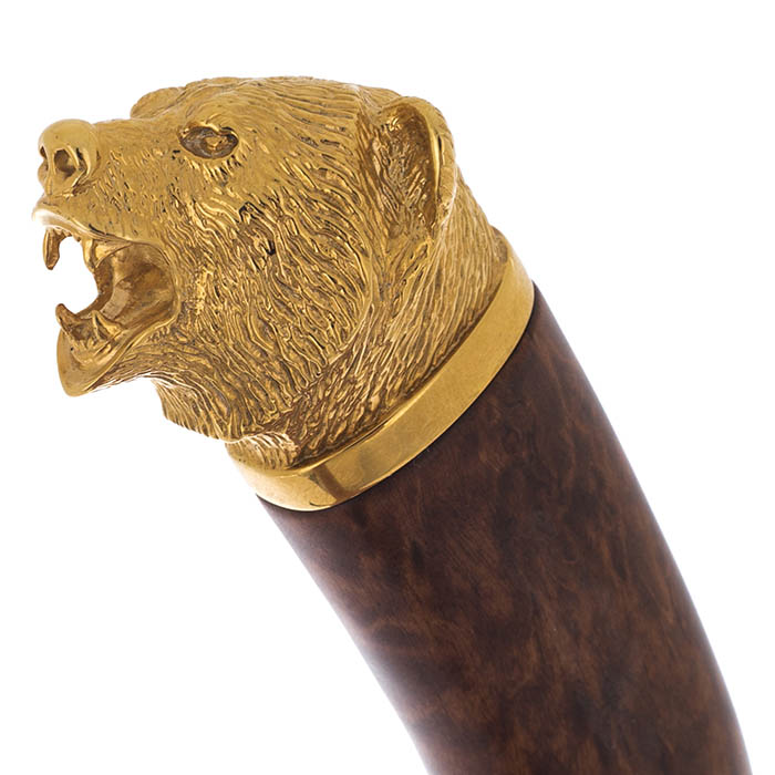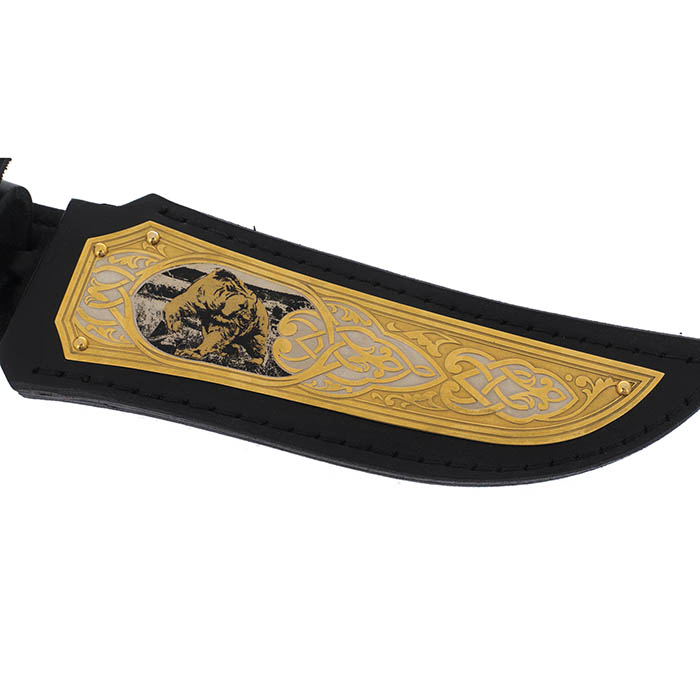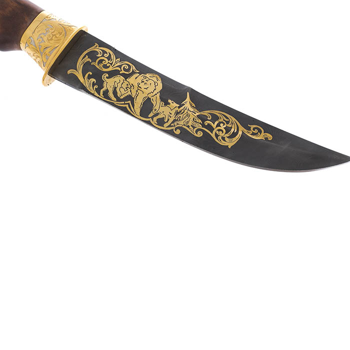 Knife Materials: black damask, brass, nickel, Karelian birch, leather, gilt, nickel.