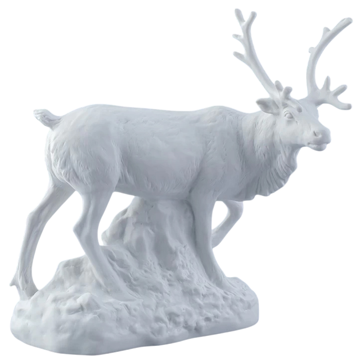 Тонкие рога, будто высеченные из снега, формируют выразительную вертикаль, уравновешивающую массив основания, выполненного в виде ледяной глыбы с мягко проработанным рельефом. Фарфор играет мягкими полутонами при боковом освещении, подчёркивая естественность образа и художественное мастерство лепщика. Цельная белизна подчёркивает характер животного, привнося в интерьер ощущение северной тишины и чистого воздуха тундры. Скульптура создаёт эмоциональный акцент без излишнего блеска, опираясь на силу формы и благородство материала.