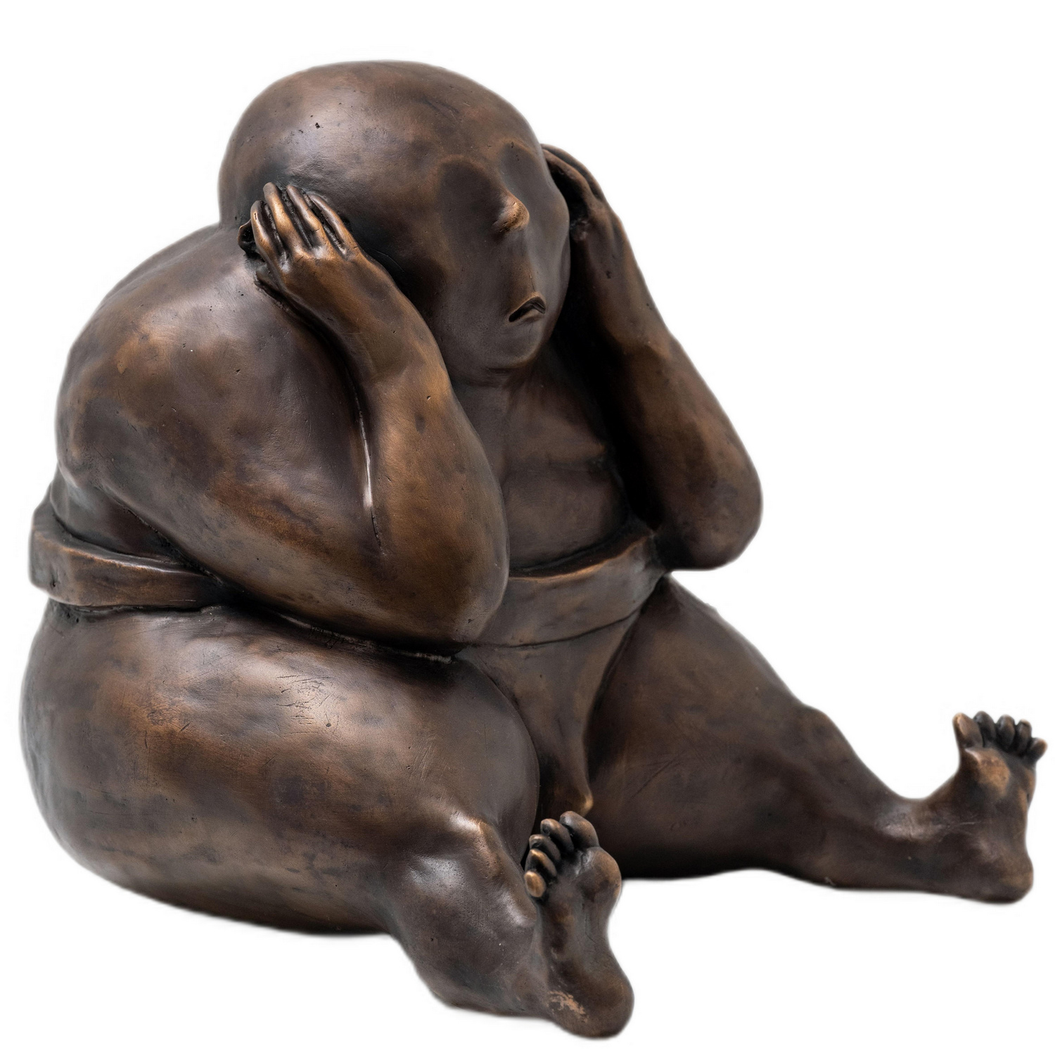 Это авторская бронзовая скульптура, созданная в выразительной, почти интимной манере, передающей редкое сочетание хрупкости и внутреннего напряжения. Образ сидящего человека, спрятавшего ладони у висков, вылеплен через округлые, полнотелые объёмы, формирующие ощущение тяжести и плотности переживаний. Плавные переходы формы, подчёркнутые мягким блеском глубокого бронзового патинирования, дают фигуре живую фактуру — будто тепло человеческой кожи едва различимо проступает сквозь металл.