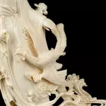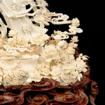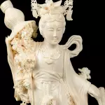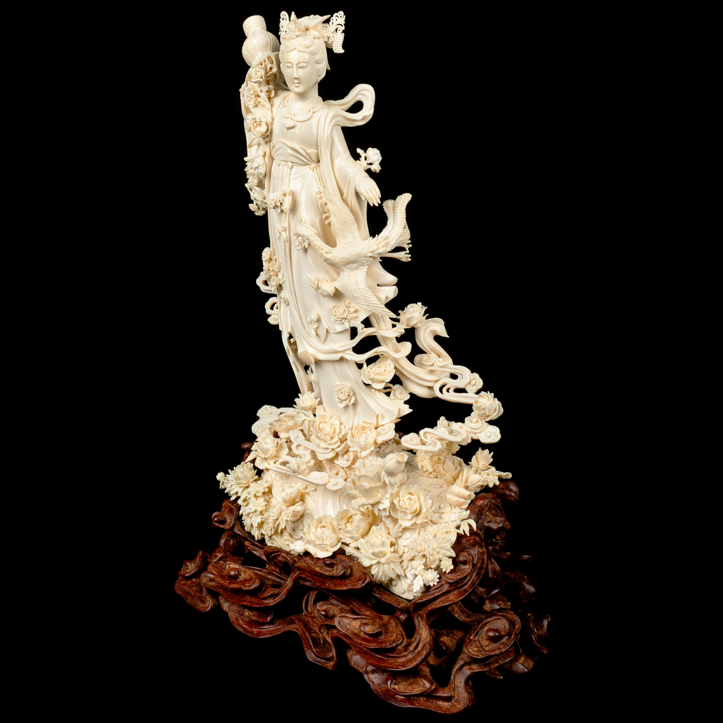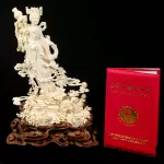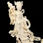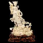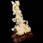 Композиция из бивня мамонта «Гуаньинь в цветах, осыпаемых с небес» — произведение кантонской резьбы, в котором традиция восточной пластики доведена до почти ювелирной тонкости. Из бивня создан образ богини милосердия Гуаньинь, окружённой цветами, плавными облачными лентами и изящной птицей, устремлённой к её ладони. Тёплый природный оттенок материала подчёркивает чистоту линий и мягкость форм, а сложная композиция, установленная на резной деревянной подставке, придаёт работе завершённость и музейный характер.