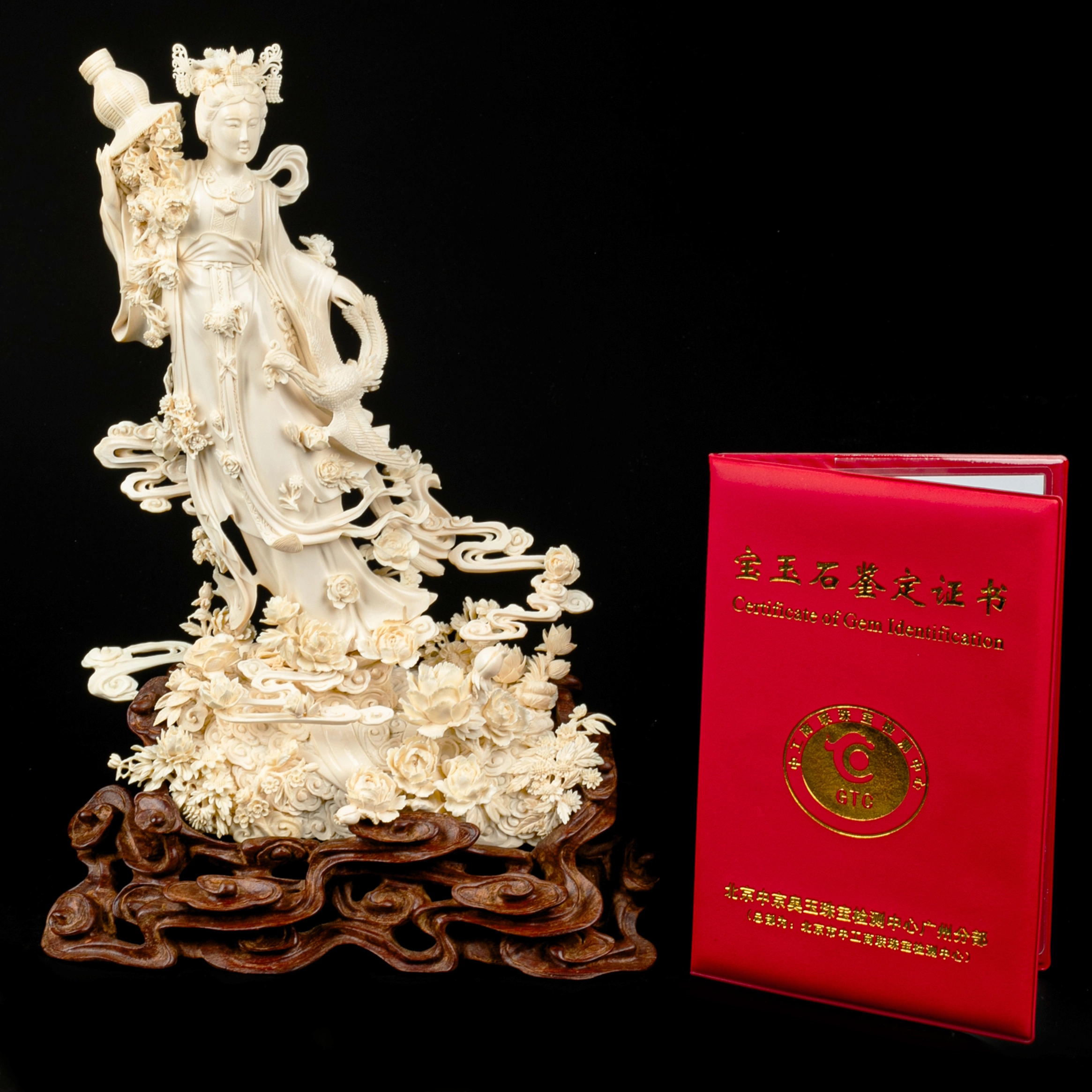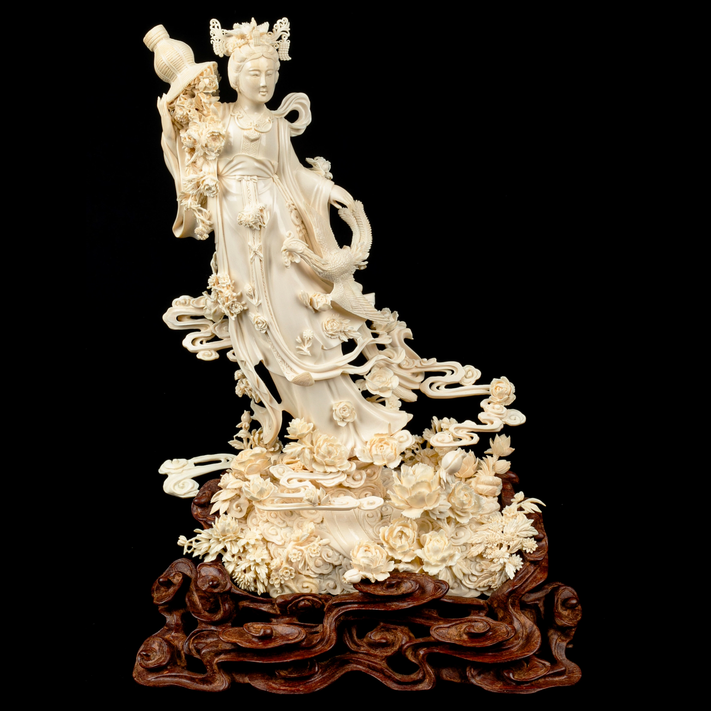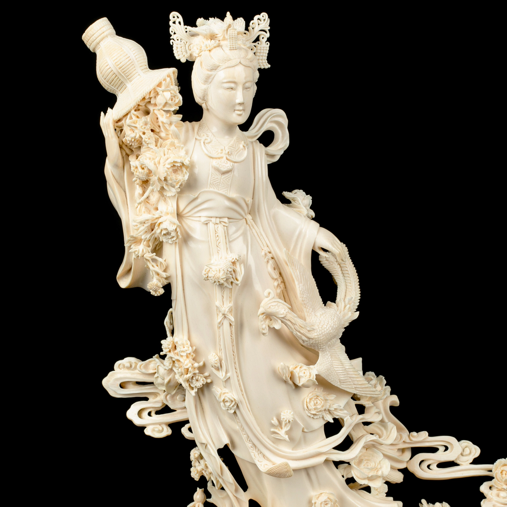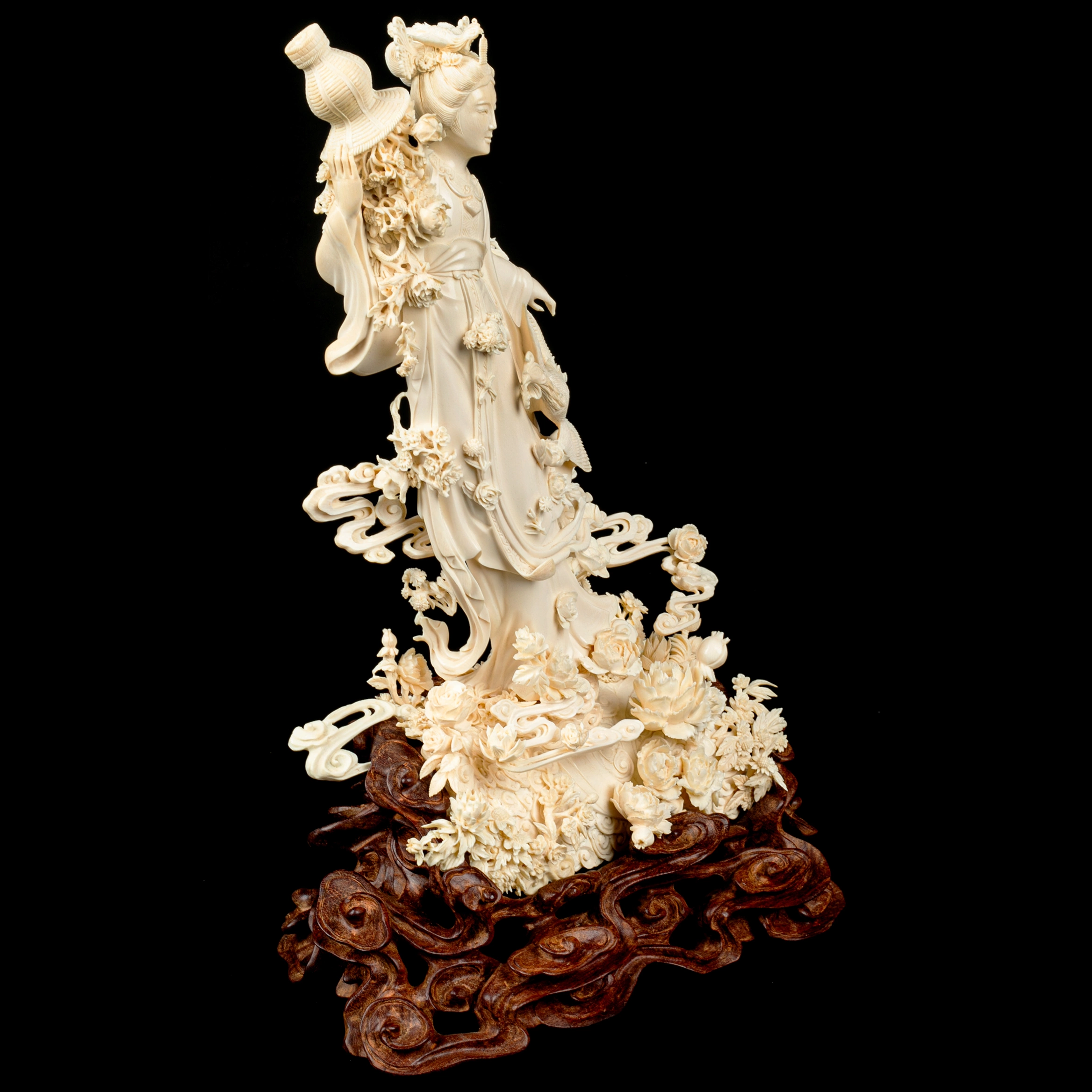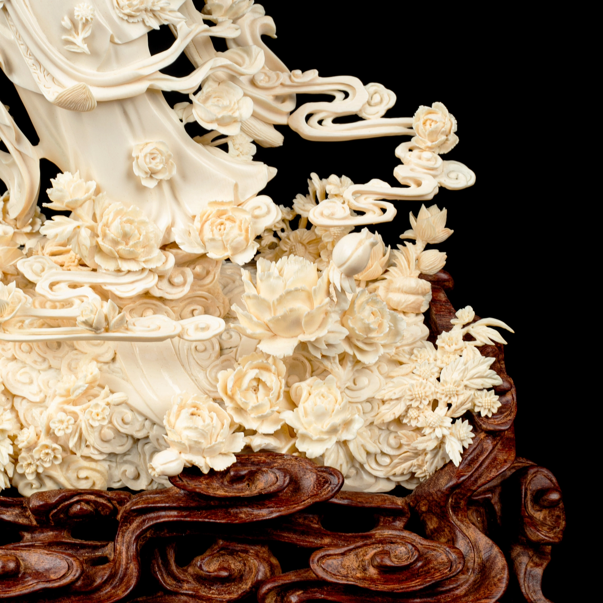 Техника кантонской резьбы предполагает многослойную проработку пространства, глубокий рельеф и филигранную детализацию. Здесь мастер создаёт ощущение движения: складки одеяний свободно ниспадают, цветы раскрываются один за другим, облака словно плывут вокруг фигуры. Поверхность обработана с исключительной аккуратностью — гладкие участки контрастируют с тончайшей прорезью лепестков и орнаментов, благодаря чему свет мягко скользит по резьбе, выявляя объём и глубину.