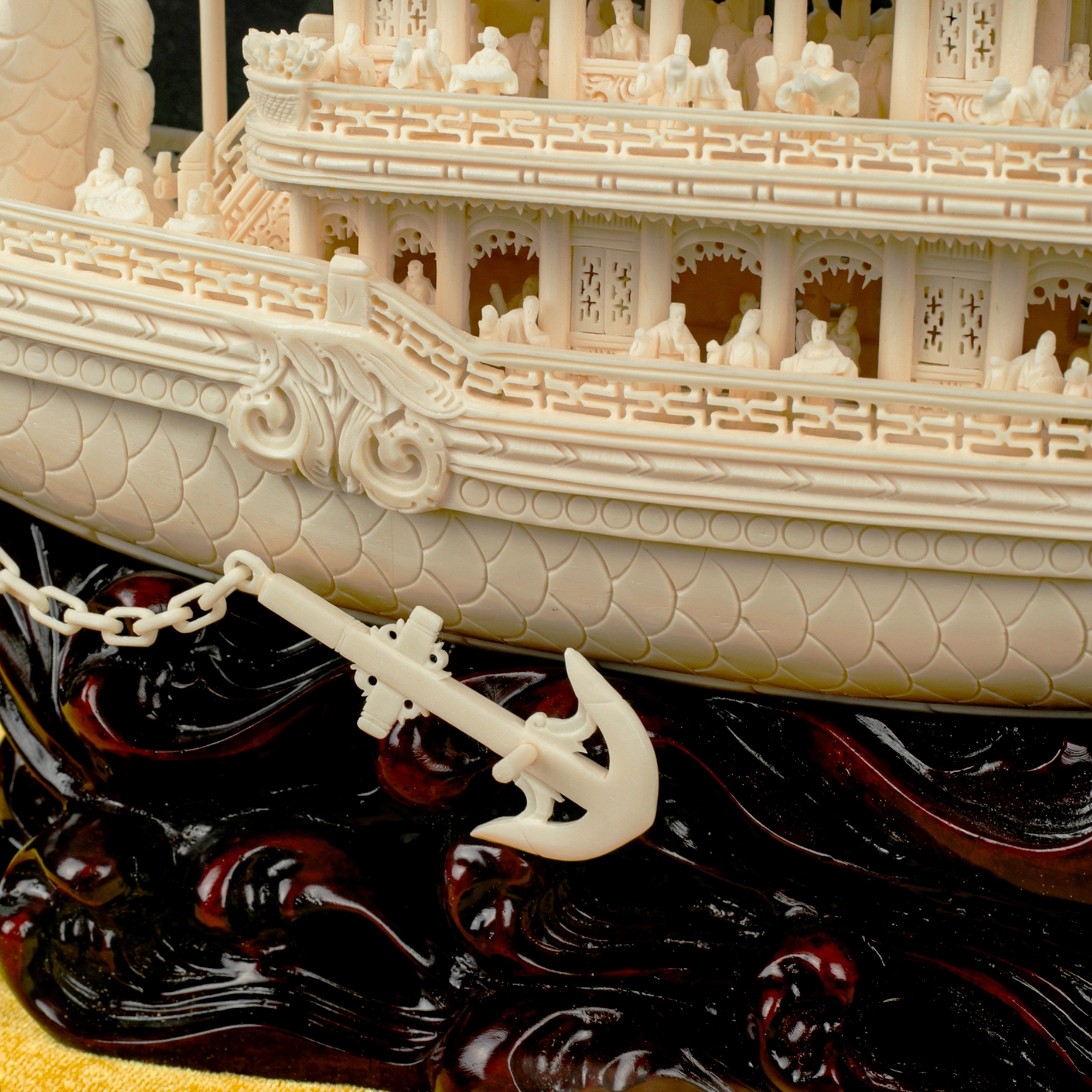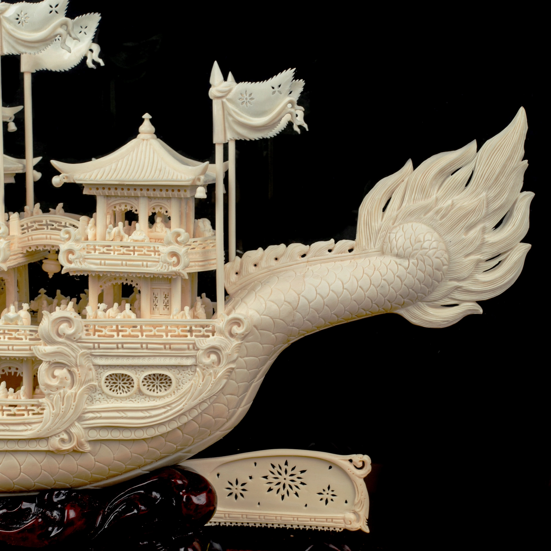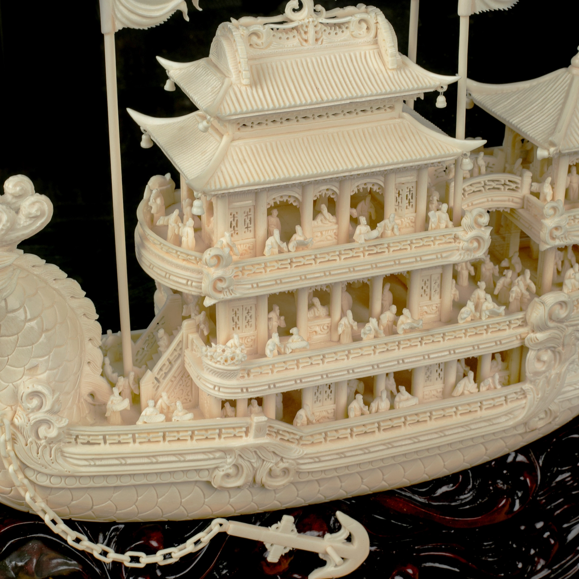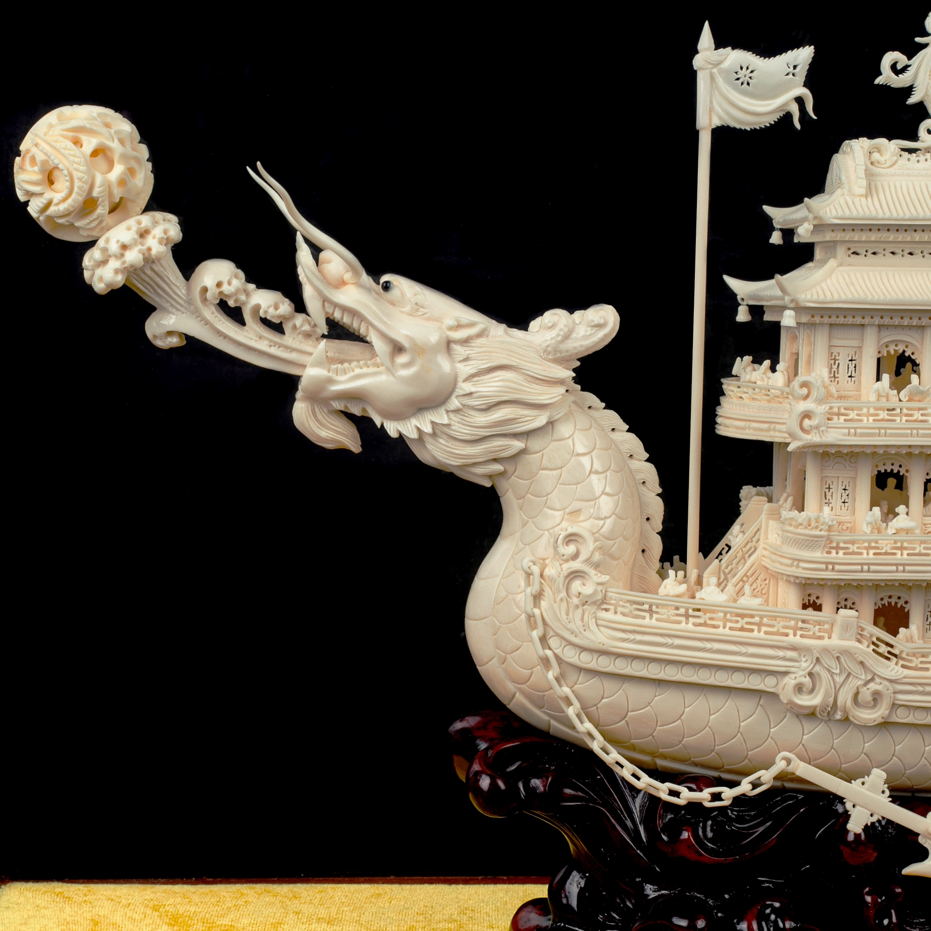 Павильоны последовательно поднимаются и опускаются, создавая ощущение движения и многослойности пространства. Сцены празднества и народных развлечений придают работе динамику и насыщенность. Благоприятный дракон с высоко поднятой головой, исполненный внутреннего достоинства, символизирует смелость движения вперёд и предвещает удачное, благополучное плавание.