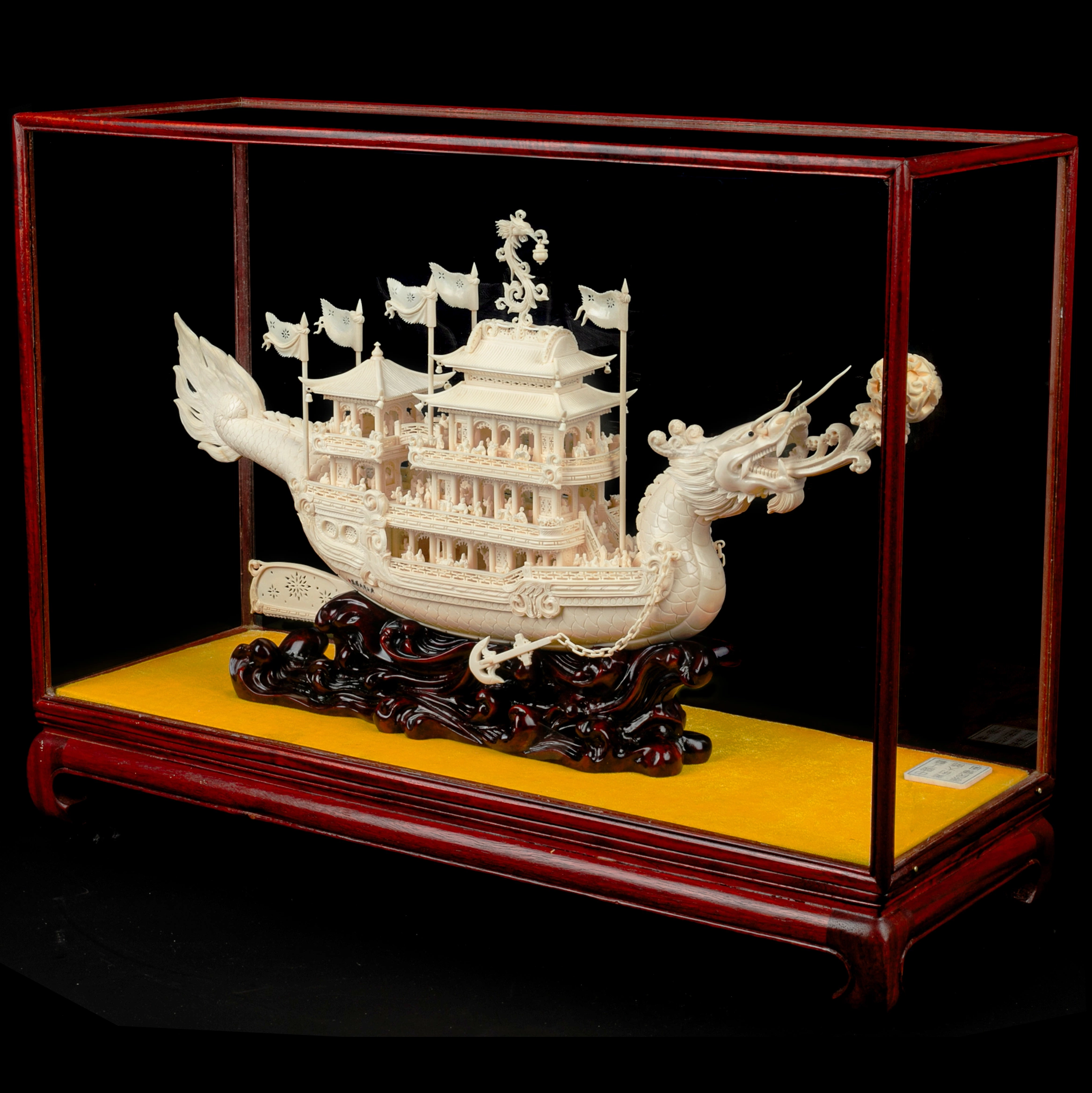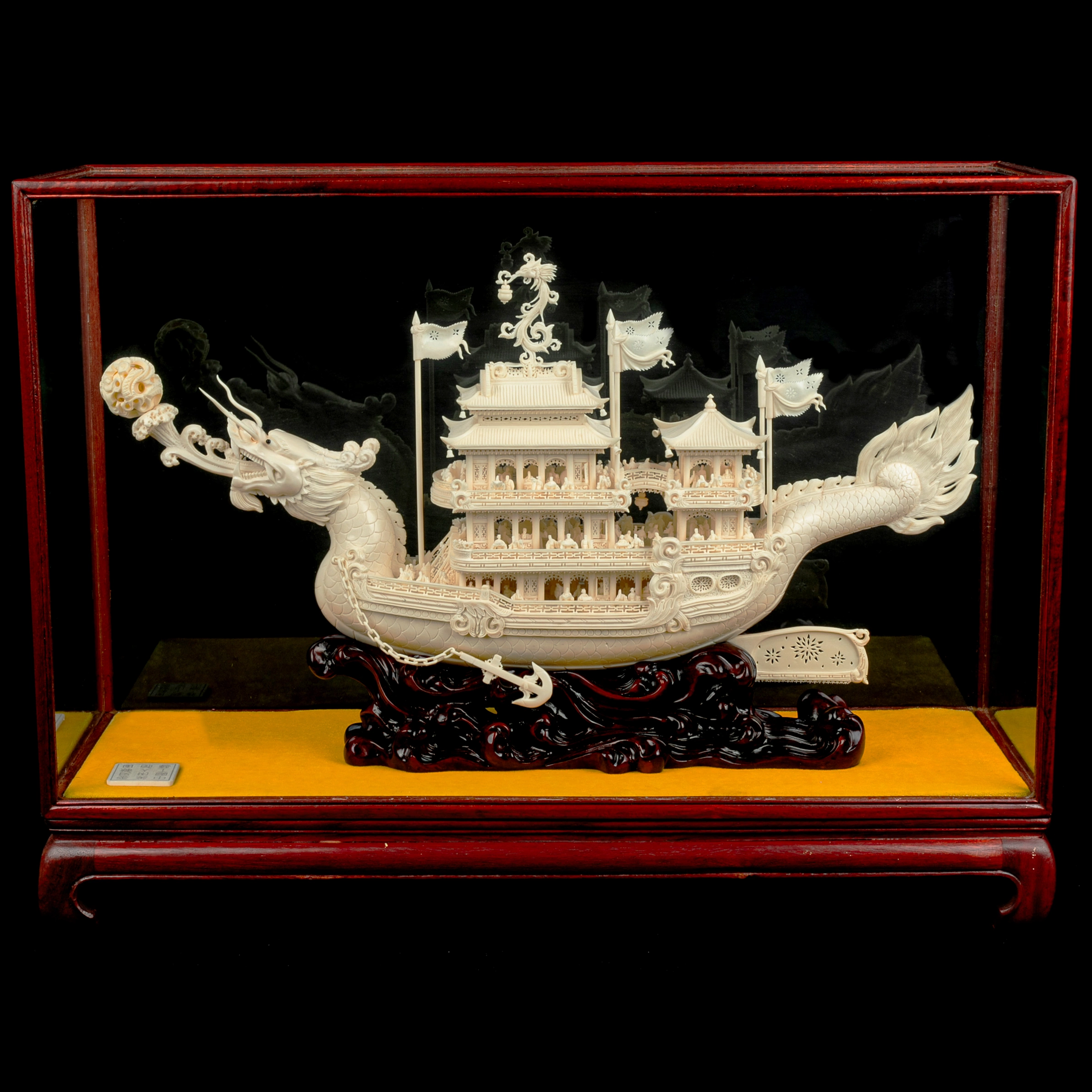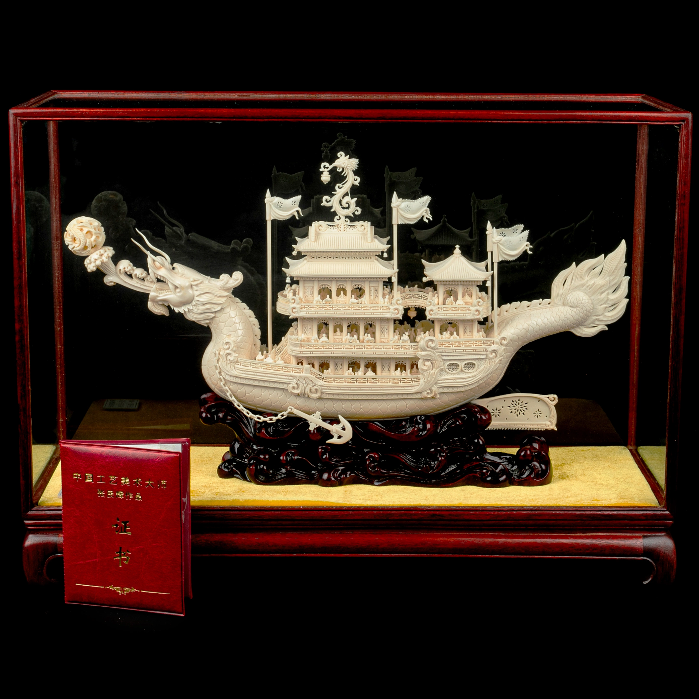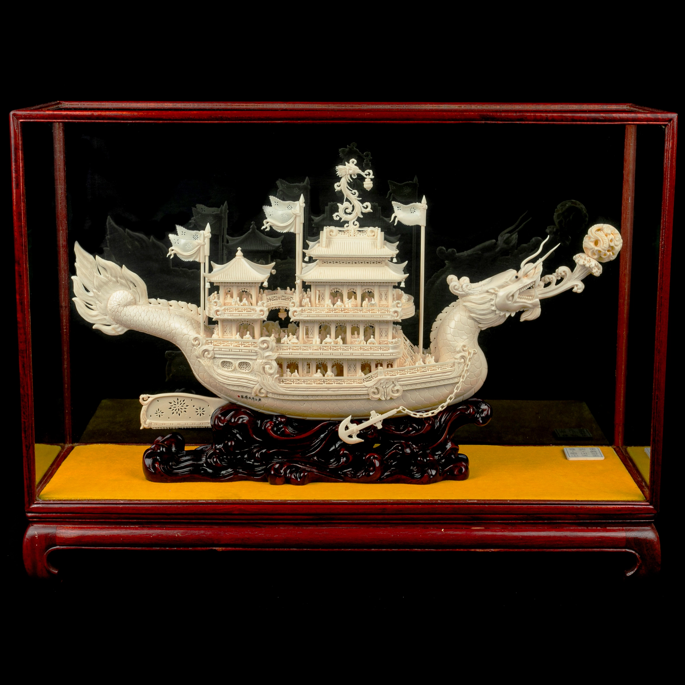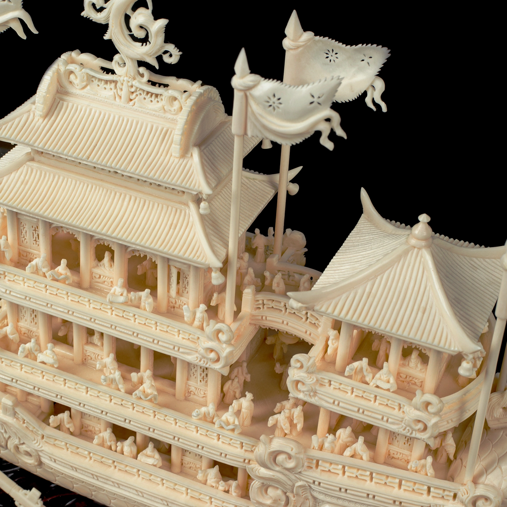 Павильоны последовательно поднимаются и опускаются, создавая ощущение движения и многослойности пространства. Сцены празднества и народных развлечений придают работе динамику и насыщенность. Благоприятный дракон с высоко поднятой головой, исполненный внутреннего достоинства, символизирует смелость движения вперёд и предвещает удачное, благополучное плавание.