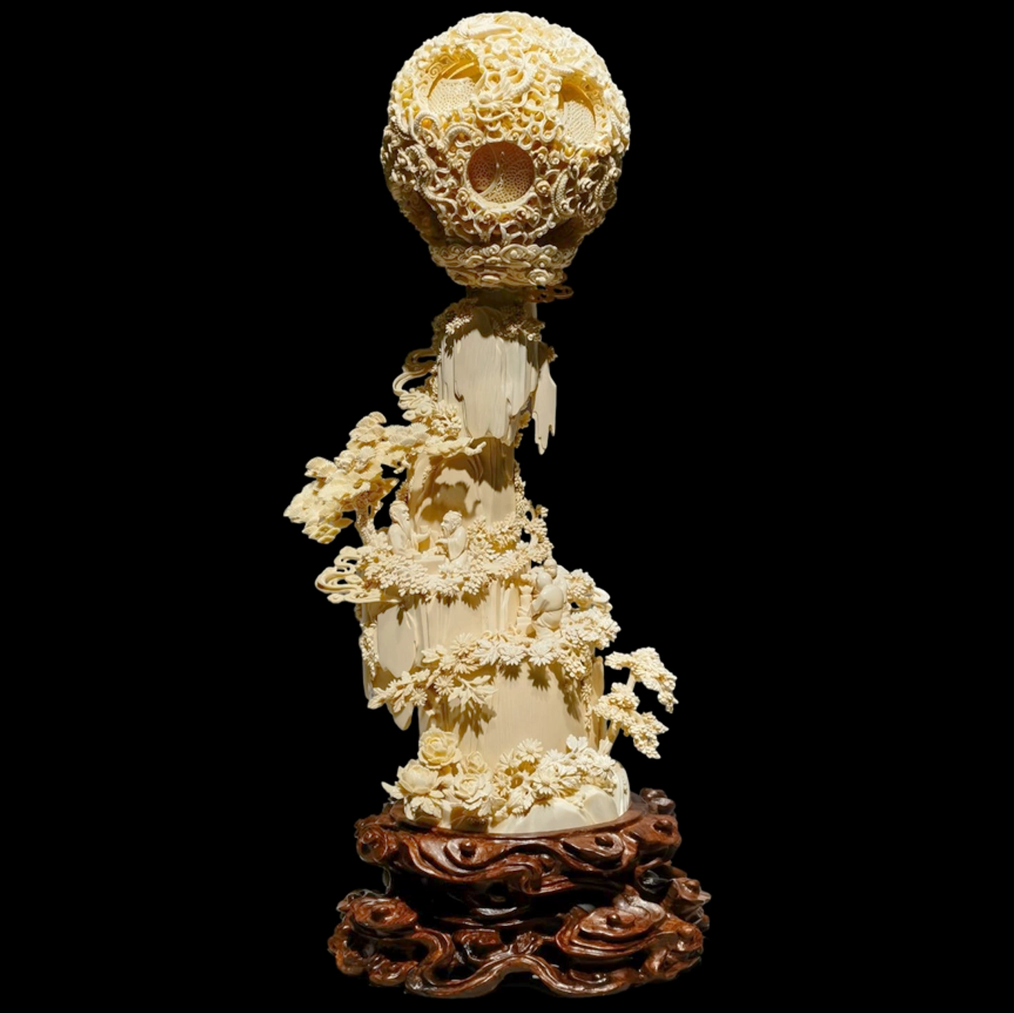 Кантонский шар из слоновой кости, известный также как «призрачный шар», — один из наиболее характерных видов гуанчжоуской резьбы, сформировавшийся ещё в эпоху династии Мин. Его уникальность заключается в том, что цельный фрагмент кости выдалбливается в многослойную сферу с переплетающимися ажурными оболочками. Каждый слой тонко проработан собственным сквозным орнаментом и может свободно вращаться внутри последующего, создавая впечатление лёгкости и почти невесомой прозрачности.