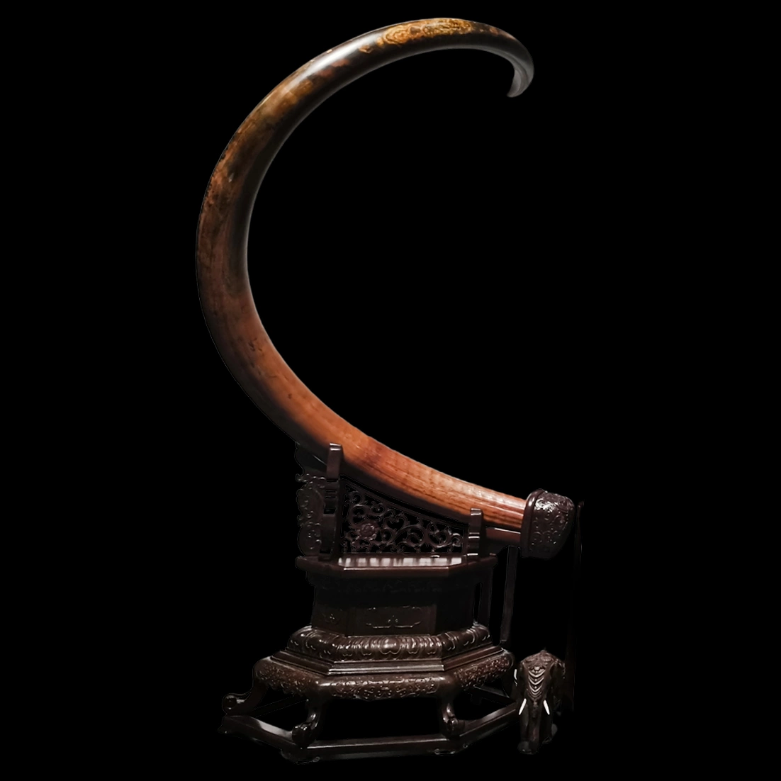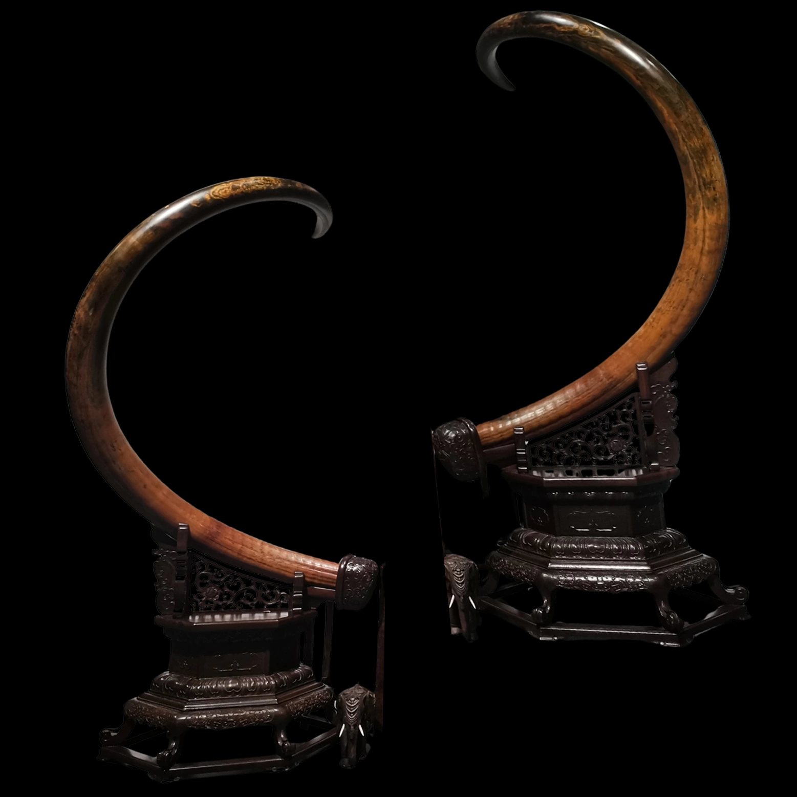«Пара неокрашенных бивней» ценится прежде всего как уникальный природный артефакт. Здесь искусство проявляется не через сложную резьбу, а через умение подчеркнуть естественную красоту редчайшего материала. Произведение напоминает о глубине времени и о том, как природные формы сами способны создавать впечатляющую художественную композицию.