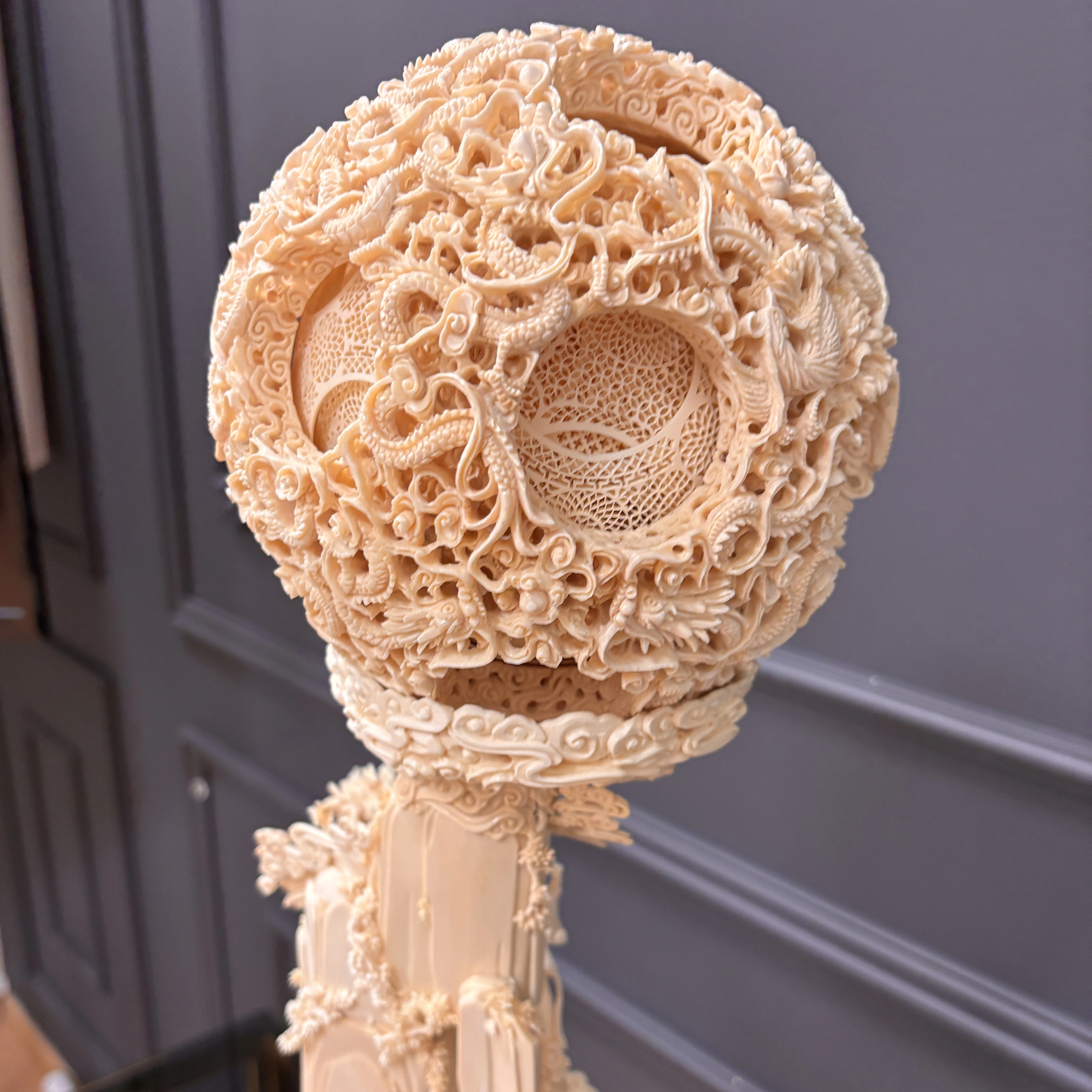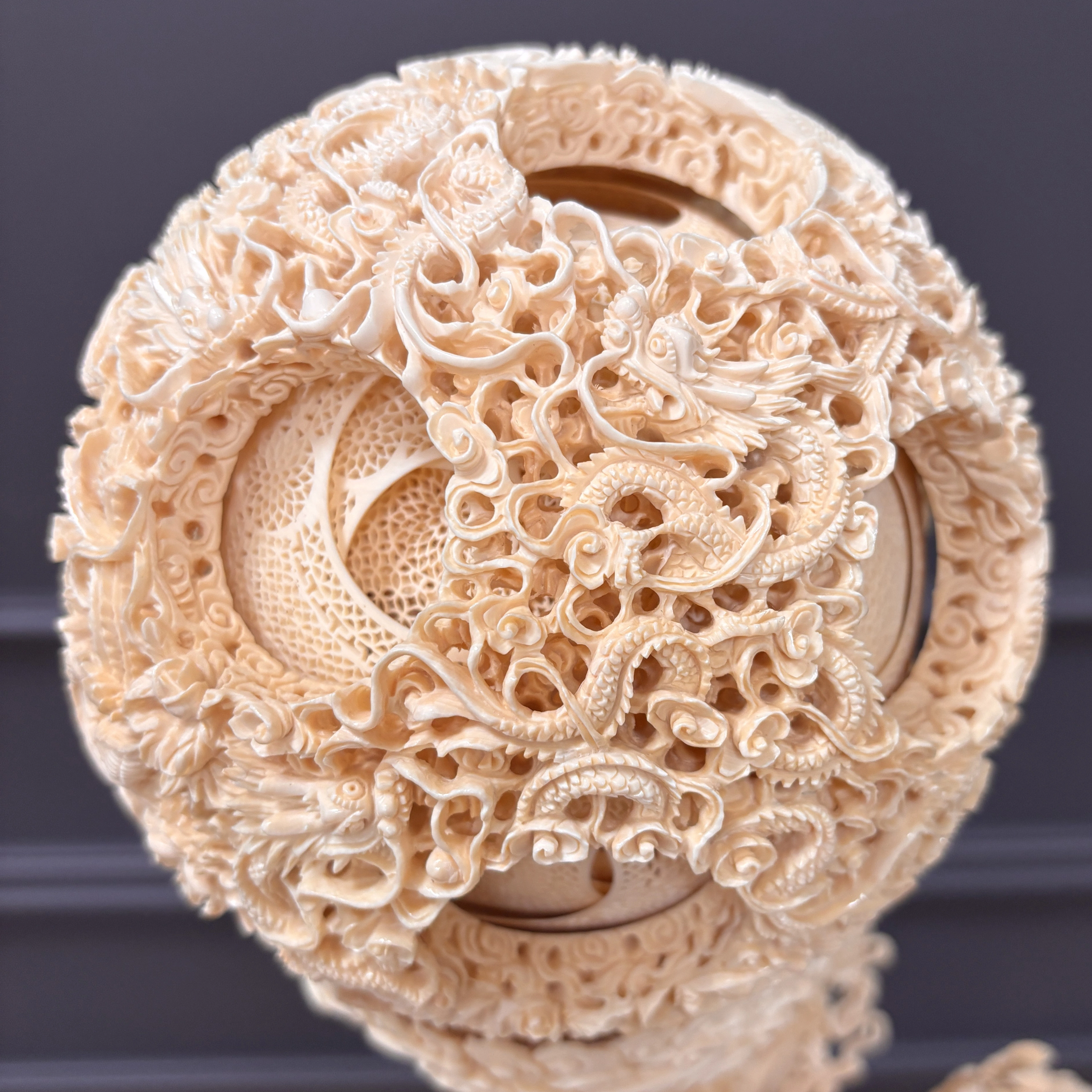 Кантонский шар из слоновой кости, известный также как «призрачный шар», — один из наиболее характерных видов гуанчжоуской резьбы, сформировавшийся ещё в эпоху династии Мин. Его уникальность заключается в том, что цельный фрагмент кости выдалбливается в многослойную сферу с переплетающимися ажурными оболочками. Каждый слой тонко проработан собственным сквозным орнаментом и может свободно вращаться внутри последующего, создавая впечатление лёгкости и почти невесомой прозрачности.