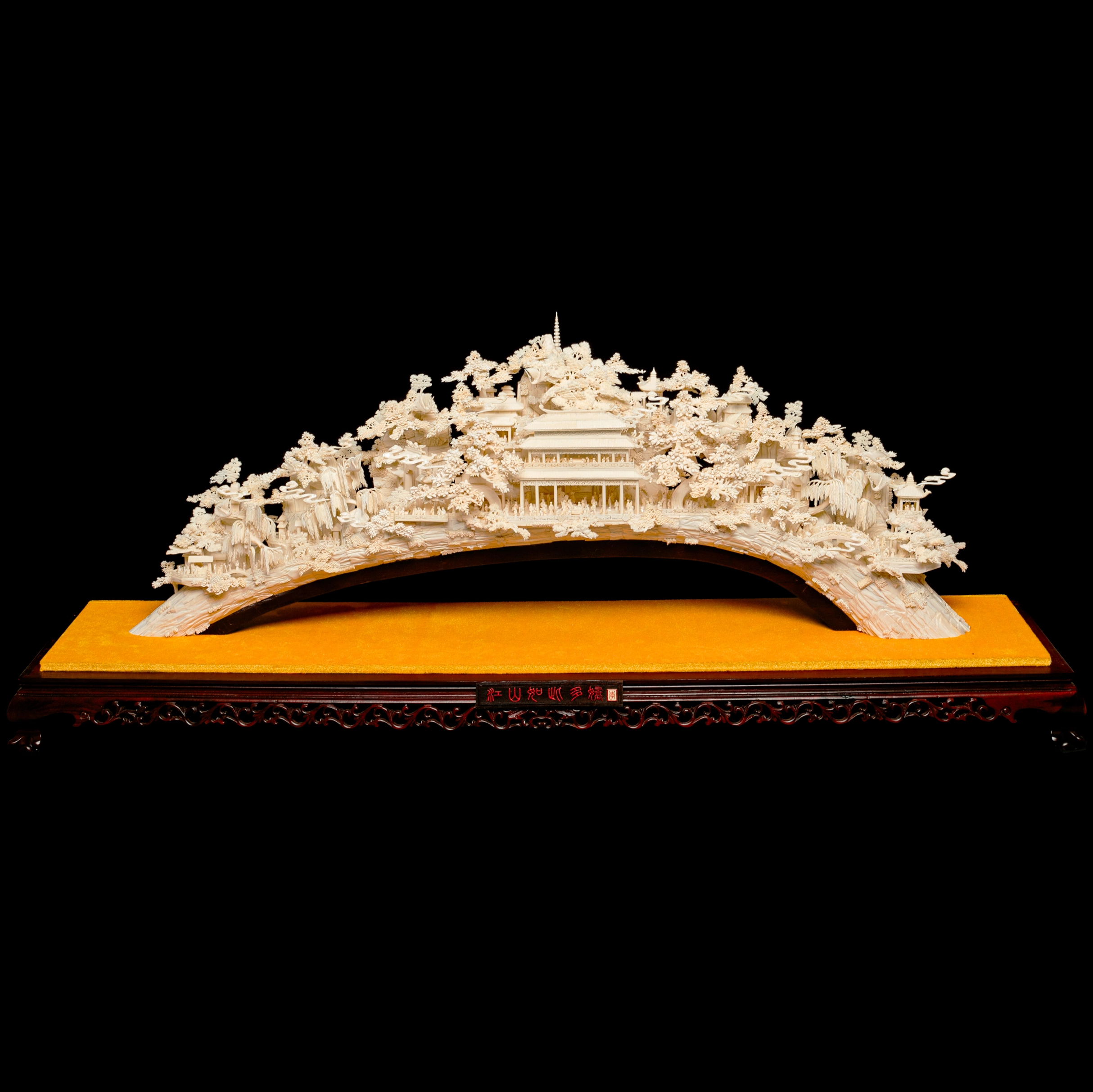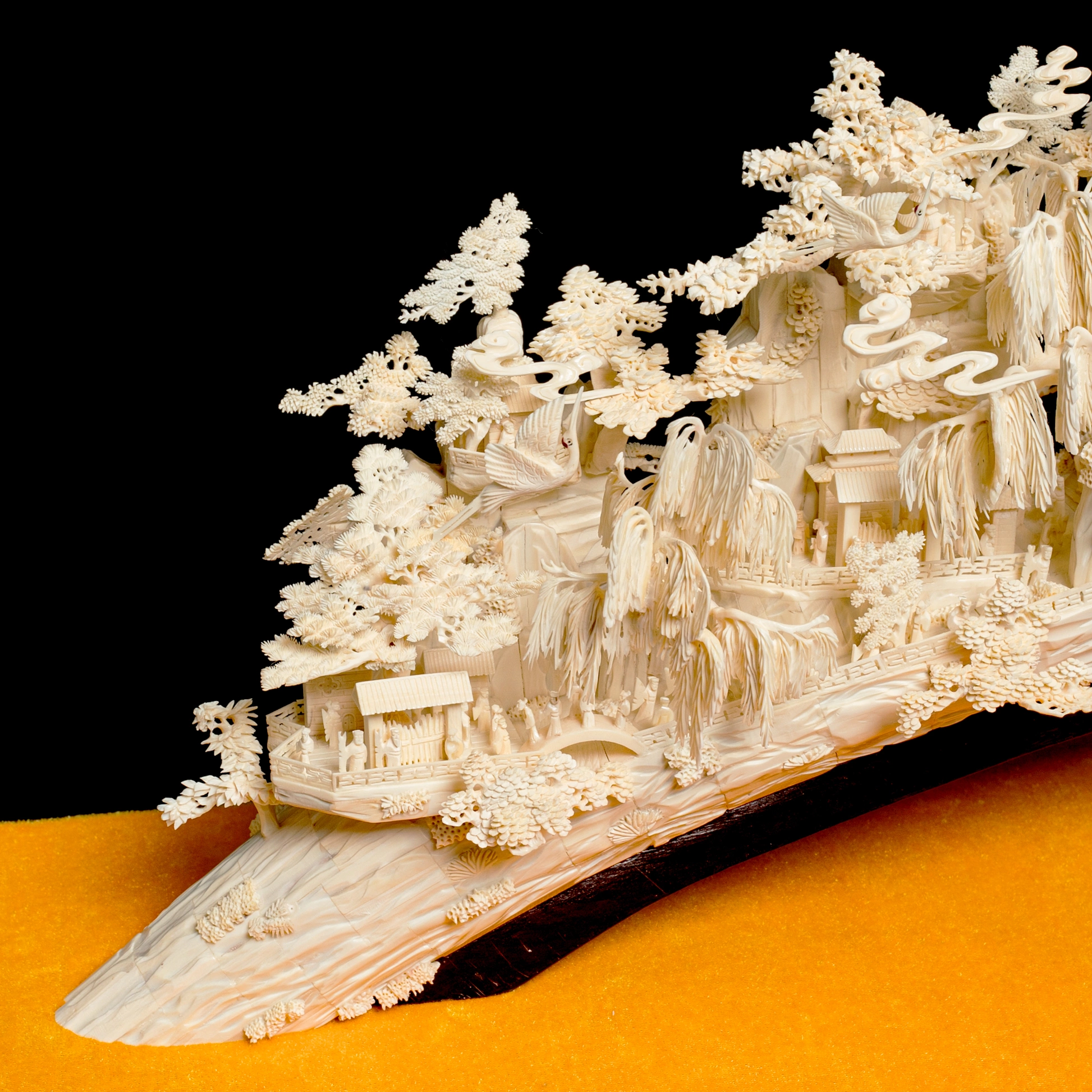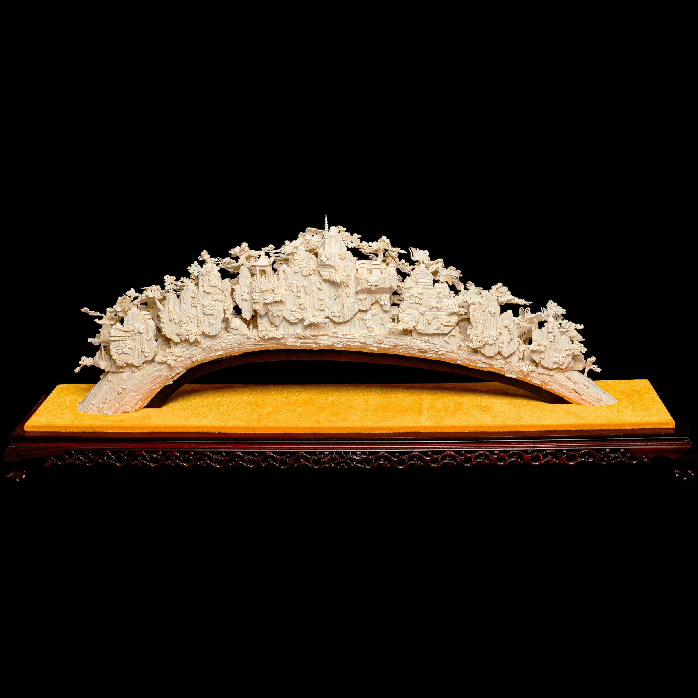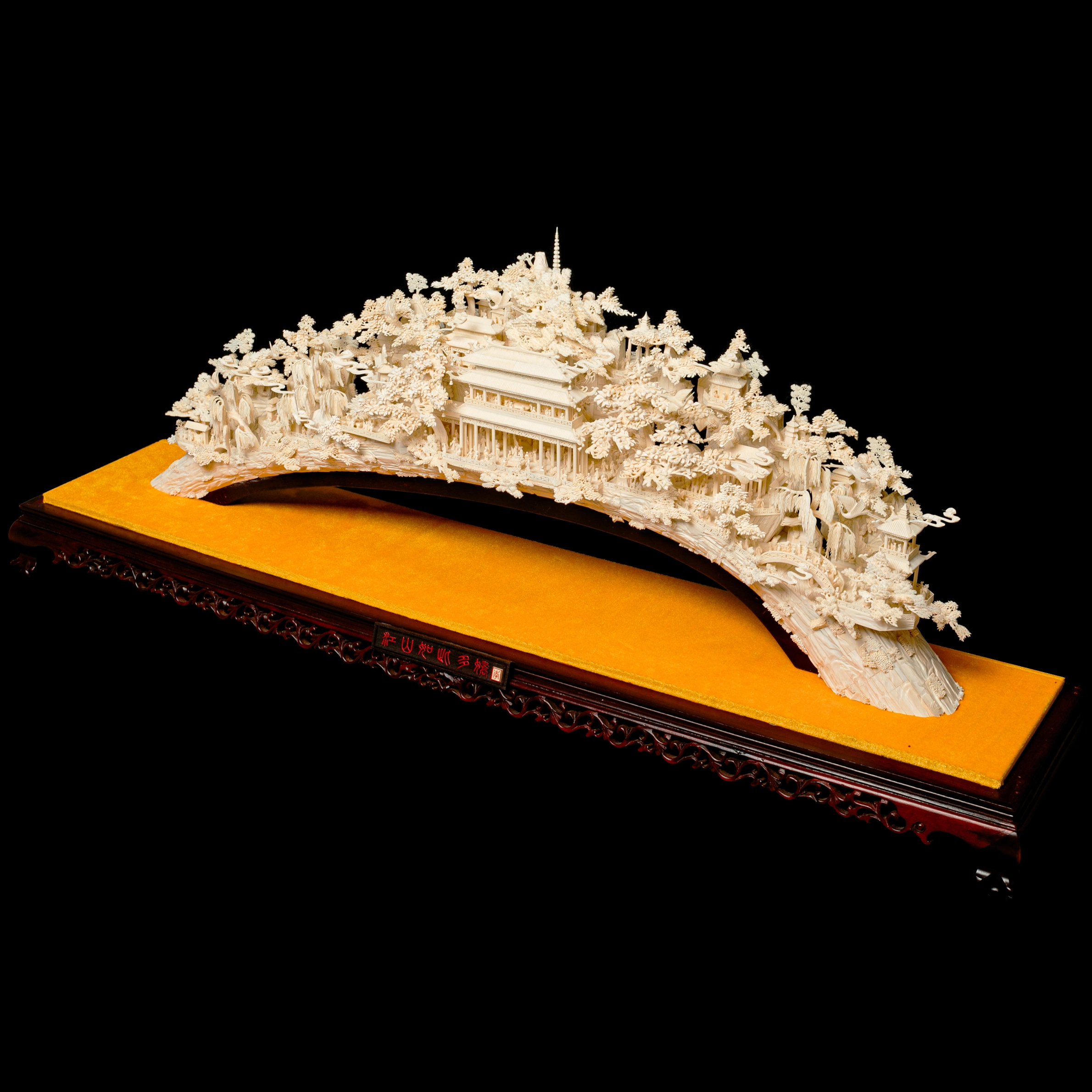 Основание выполнено из тёмного дерева с ажурной резьбой, подчёркивающей статус произведения и создающей контраст с благородным кремовым оттенком бивня. «Прекрасный Китай» — это не просто декоративный объект, а музейный уровень исполнения, воплощение традиций кантонской школы, известной своей филигранной детализацией и сложной пространственной композицией. Предмет рассчитан на коллекционеров, ценителей восточной культуры и инвесторов в редкие художественные произведения, где соединены исторический сюжет, редкий материал и высочайшее мастерство резчика.