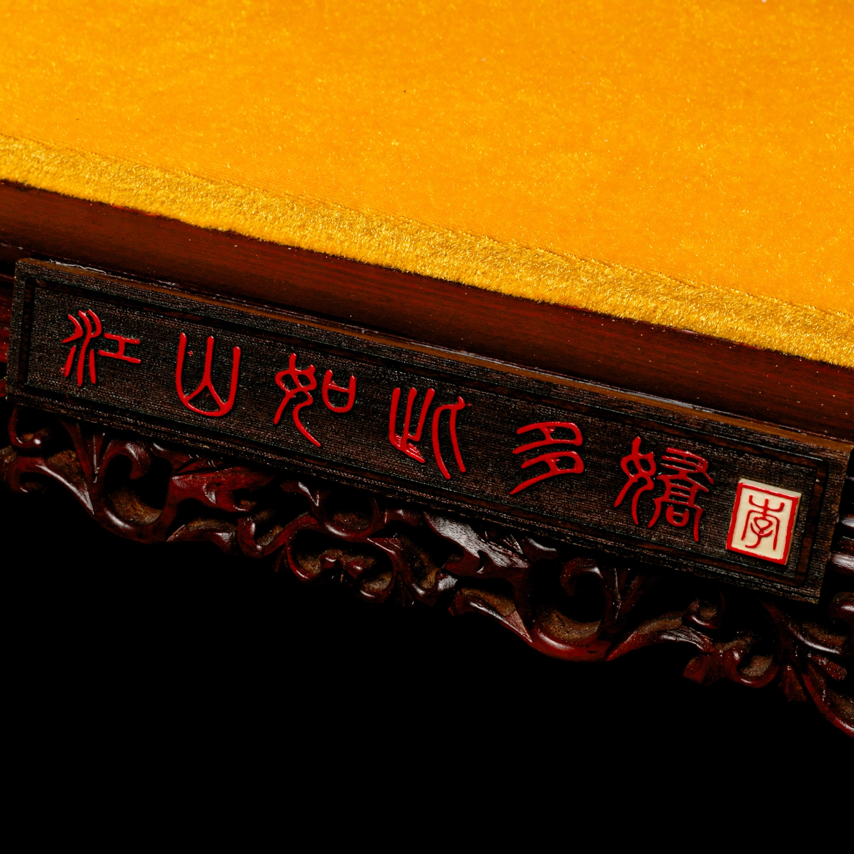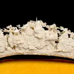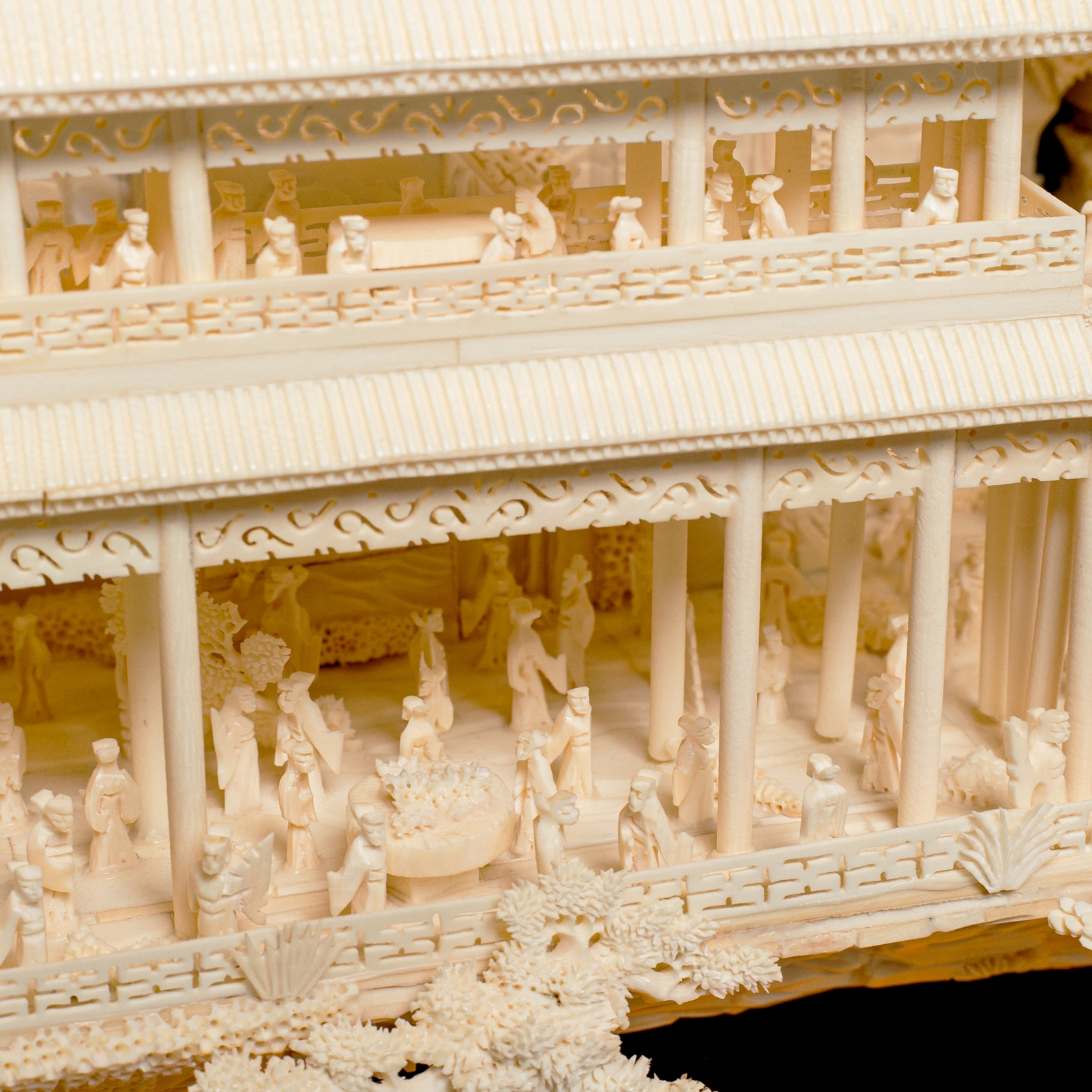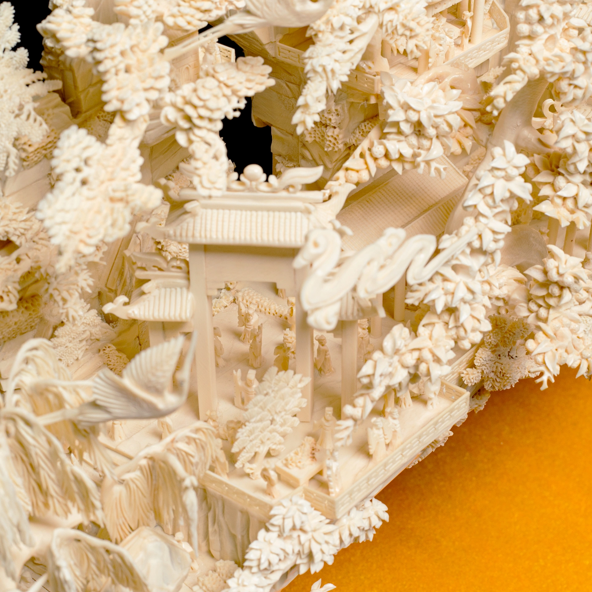 Основание выполнено из тёмного дерева с ажурной резьбой, подчёркивающей статус произведения и создающей контраст с благородным кремовым оттенком бивня. «Прекрасный Китай» — это не просто декоративный объект, а музейный уровень исполнения, воплощение традиций кантонской школы, известной своей филигранной детализацией и сложной пространственной композицией. Предмет рассчитан на коллекционеров, ценителей восточной культуры и инвесторов в редкие художественные произведения, где соединены исторический сюжет, редкий материал и высочайшее мастерство резчика.