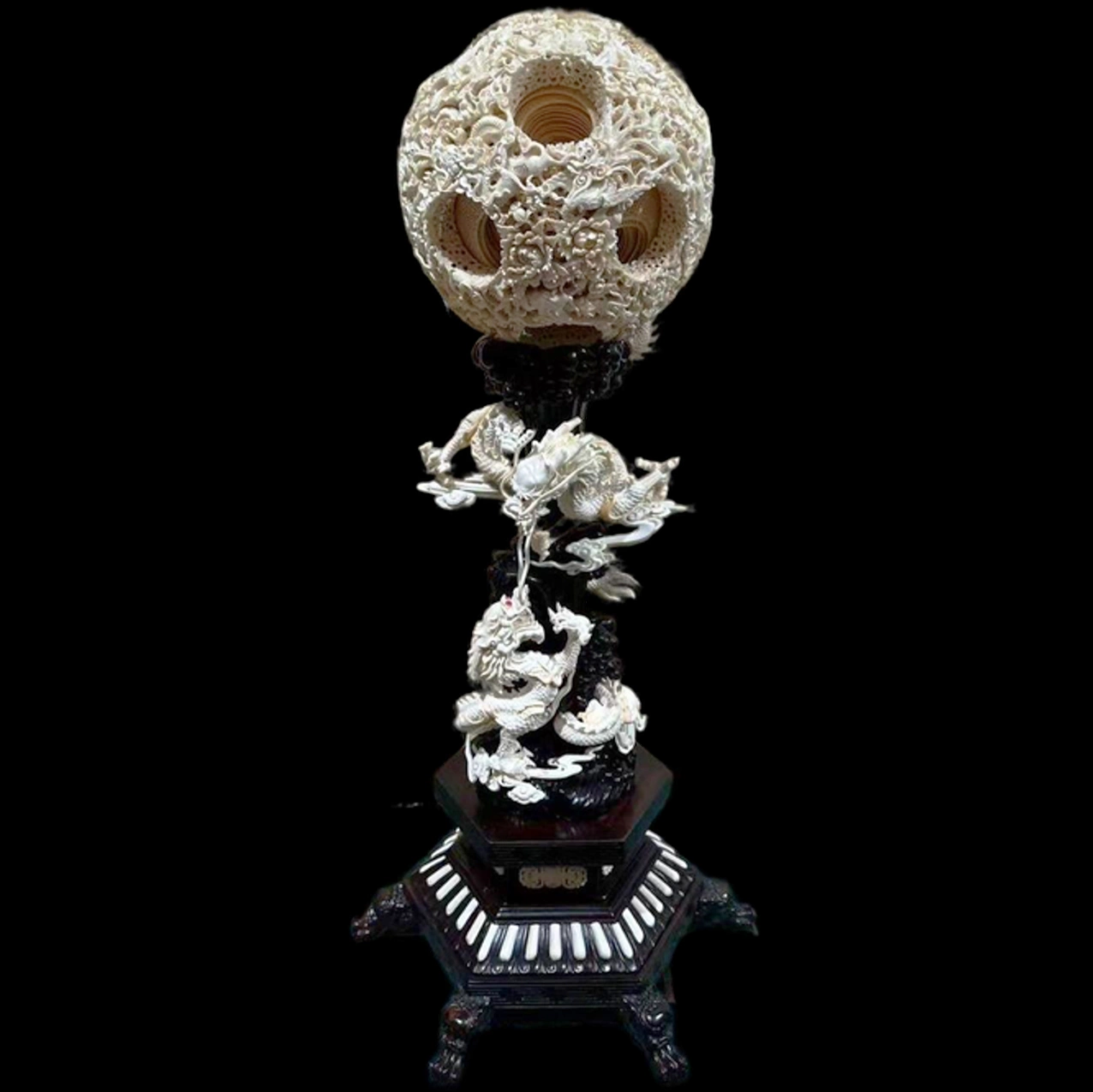 В верхней части композиции расположен знаменитый кантонский резной шар — одно из наиболее сложных достижений китайского художественного мастерства. Этот многослойный шар вырезается из цельного куска материала и состоит из нескольких вложенных сфер, каждая из которых свободно вращается внутри другой. Поверхность шара покрыта тончайшим ажурным орнаментом, напоминающим переплетение облаков, цветов и волн. Подобные шары традиционно символизируют совершенство, бесконечность мира и гармонию небесного порядка.