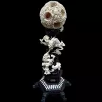 Светлая резьба из мамонтовой кости контрастирует с тёмной колонной основания, благодаря чему композиция приобретает выразительную глубину. Этот контраст усиливает пластичность форм и подчёркивает мастерство художника, сумевшего соединить разные уровни пространства — от сложной ажурной сферы до плавных линий драконьего тела.