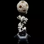 Светлая резьба из мамонтовой кости контрастирует с тёмной колонной основания, благодаря чему композиция приобретает выразительную глубину. Этот контраст усиливает пластичность форм и подчёркивает мастерство художника, сумевшего соединить разные уровни пространства — от сложной ажурной сферы до плавных линий драконьего тела.