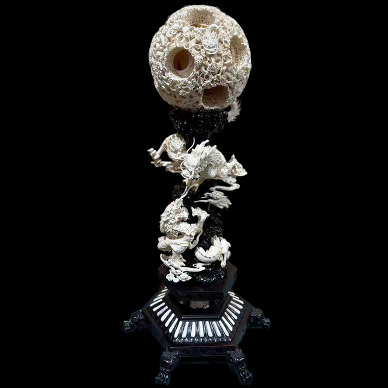 В верхней части композиции расположен знаменитый кантонский резной шар — одно из наиболее сложных достижений китайского художественного мастерства. Этот многослойный шар вырезается из цельного куска материала и состоит из нескольких вложенных сфер, каждая из которых свободно вращается внутри другой. Поверхность шара покрыта тончайшим ажурным орнаментом, напоминающим переплетение облаков, цветов и волн. Подобные шары традиционно символизируют совершенство, бесконечность мира и гармонию небесного порядка.