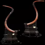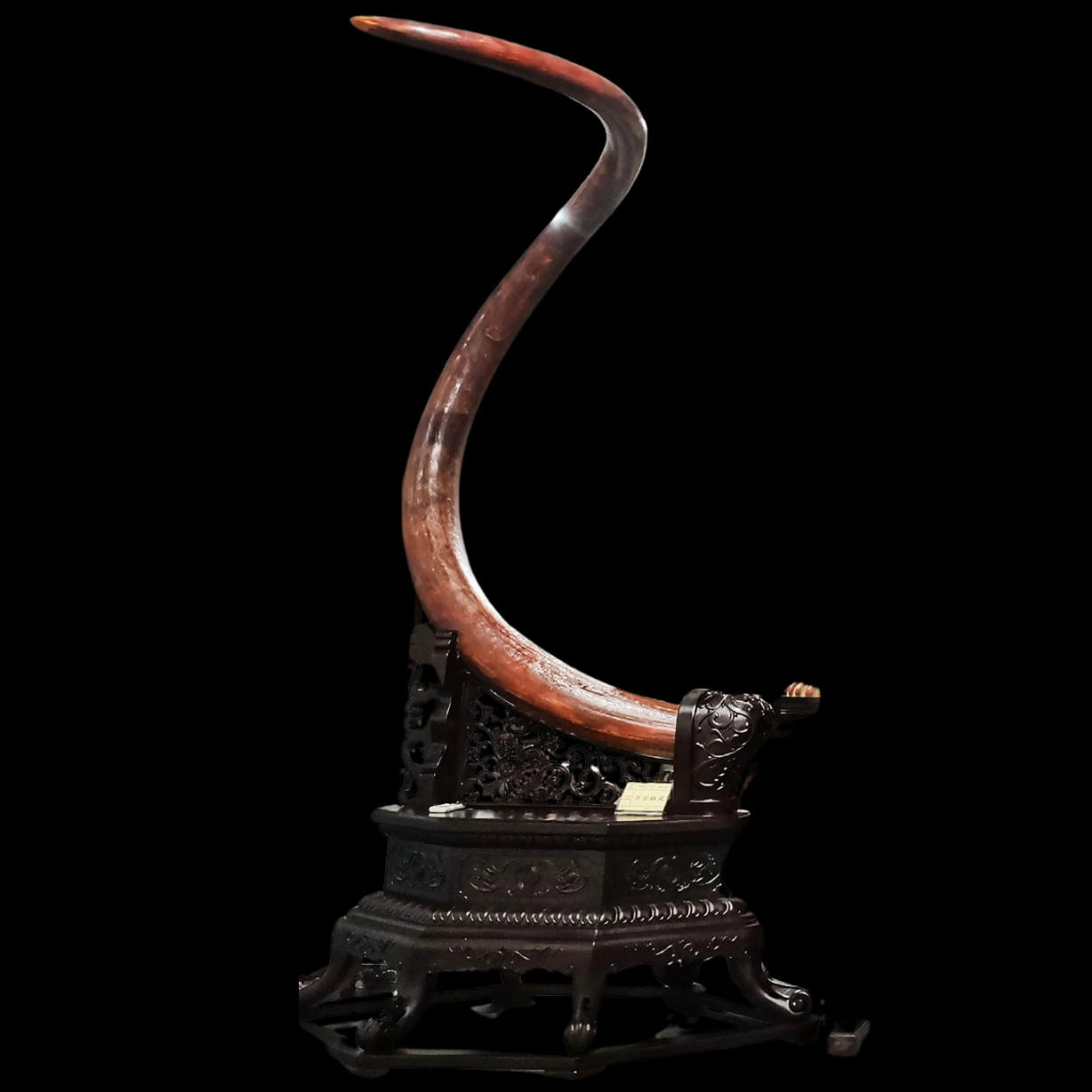 Тёмное резное основание выполнено из дерева и украшено традиционными орнаментами. Оно служит контрастным фундаментом, на котором светлая поверхность мамонтовой кости выглядит особенно выразительно. Декоративная резьба подставки придаёт композиции устойчивость и торжественность, одновременно подчёркивая её музейный характер.