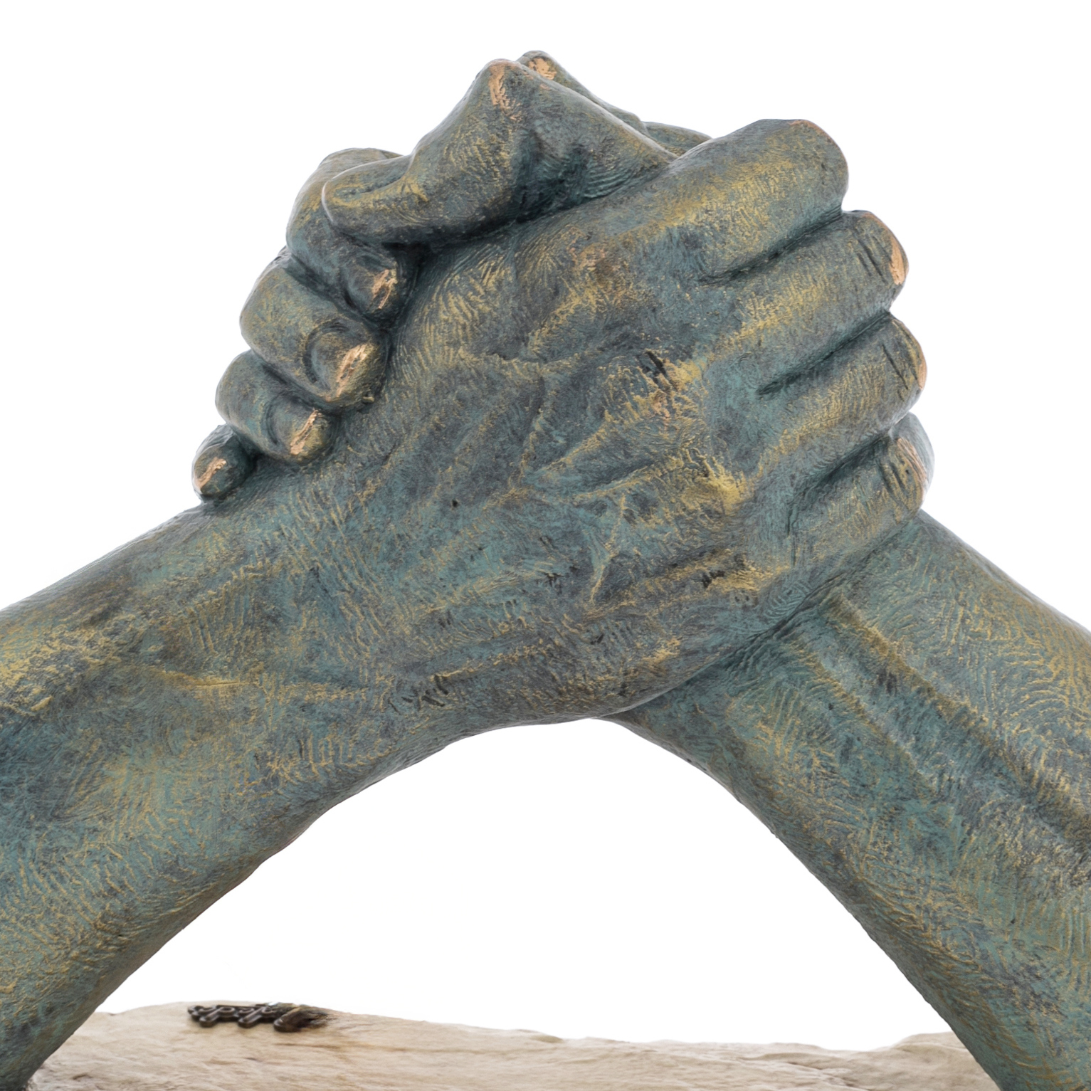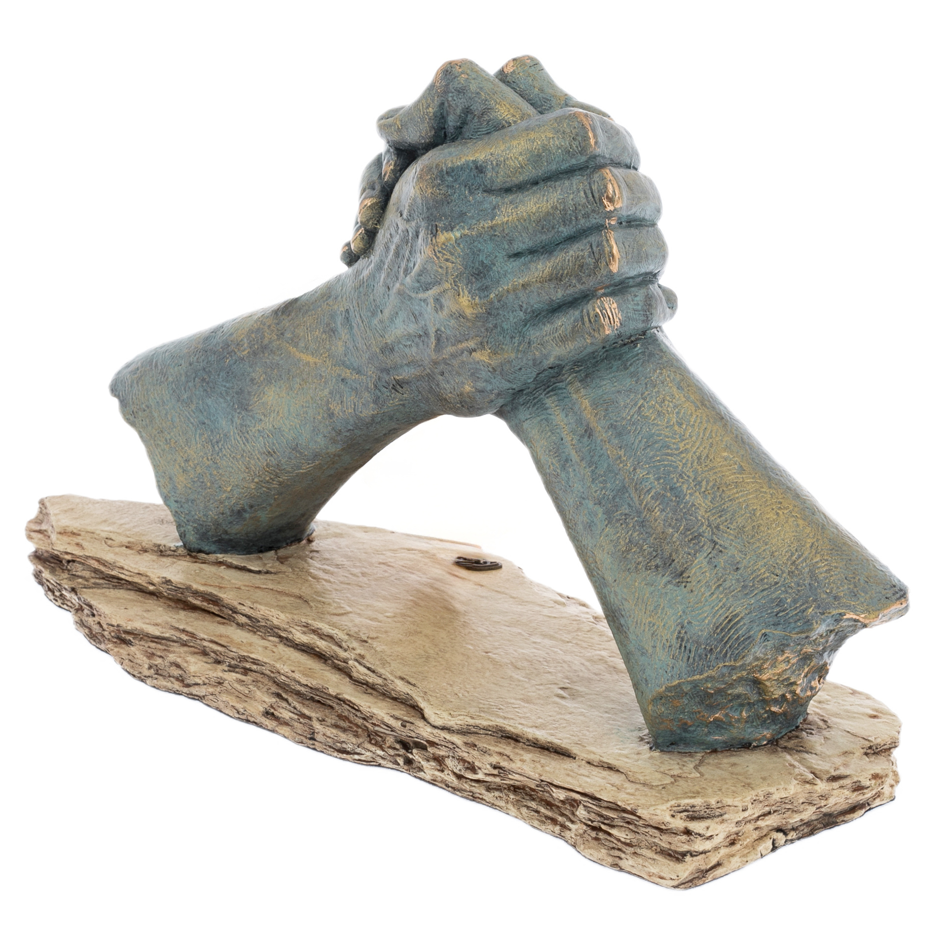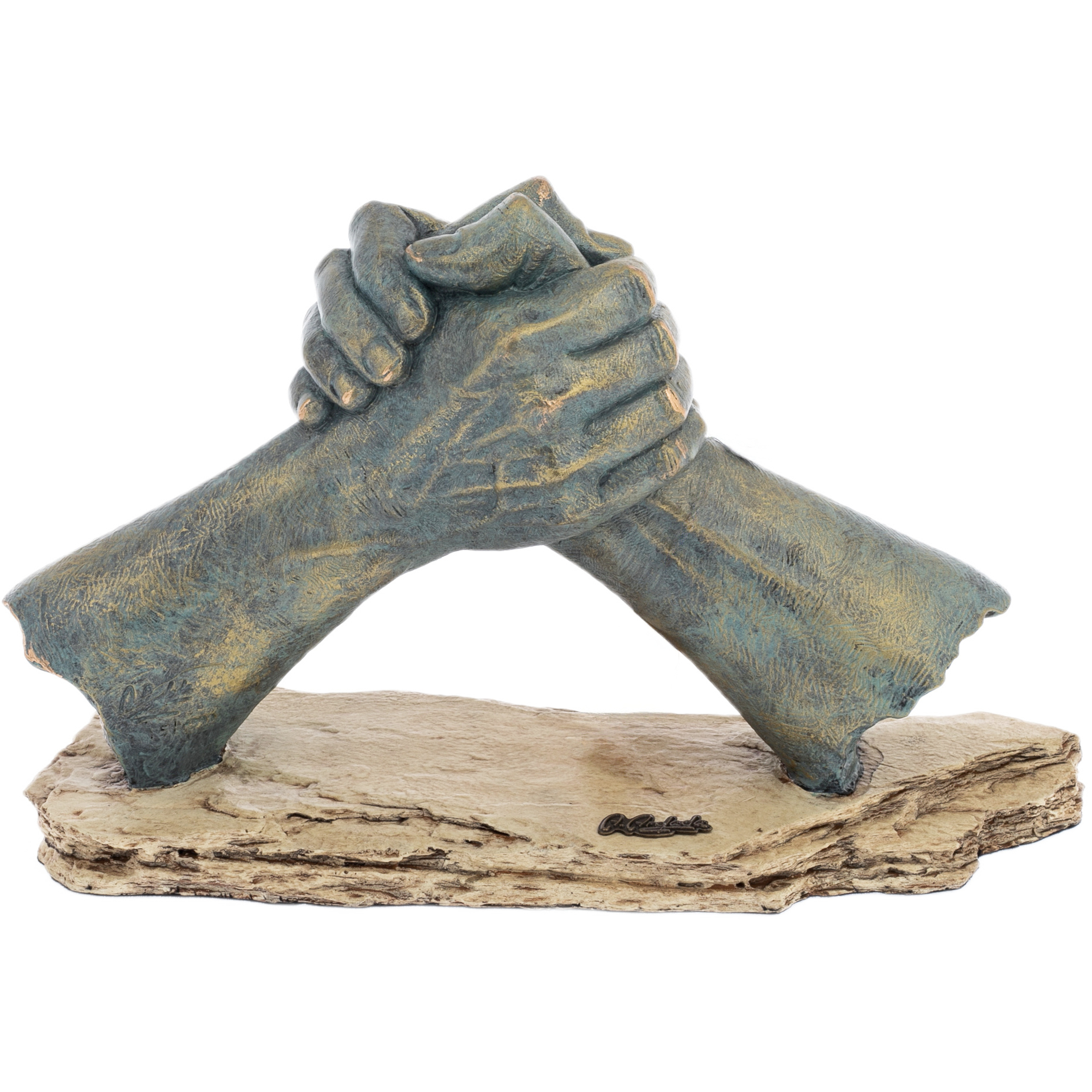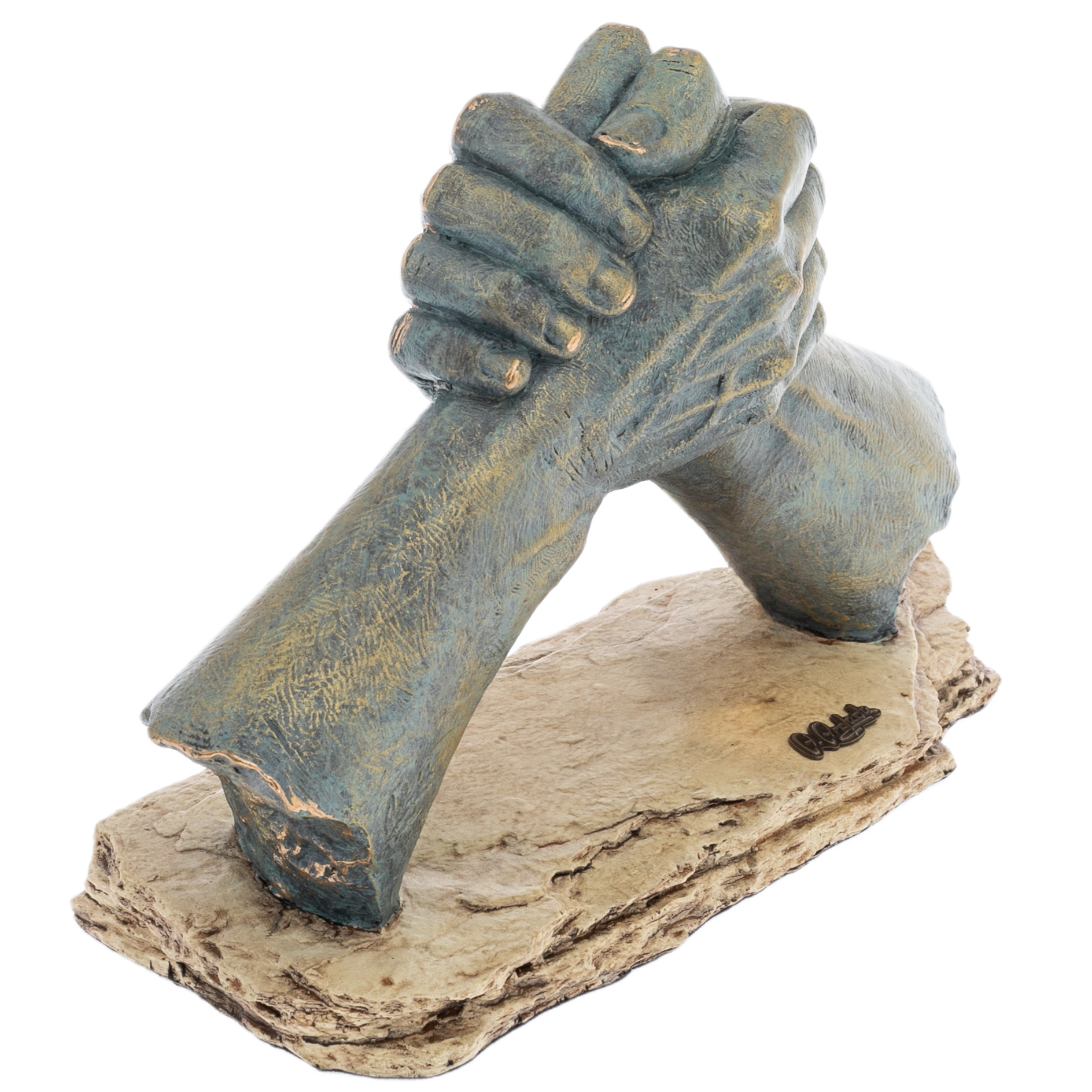 Two hands clasped in a firm handshake represent an indestructible union that will carry strength, loyalty and determination through time. This sculpture, embodied in bronze with patina, captures the moment when two worlds merge into a single entity. Every vein, every line on the palms is a trace of a great story, inscribed in metal by a masterful hand.