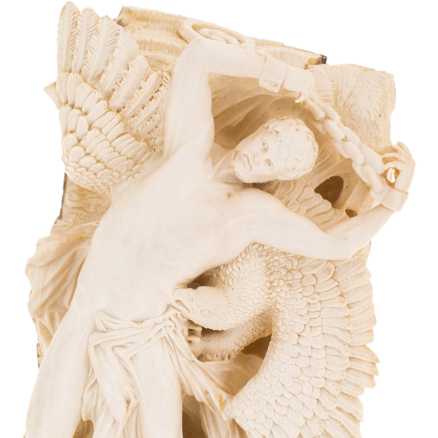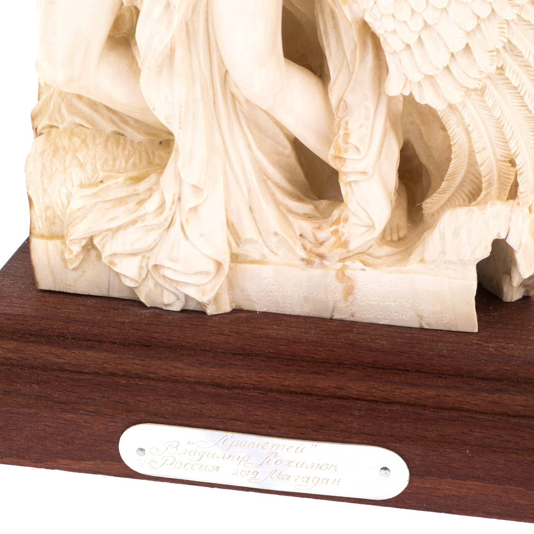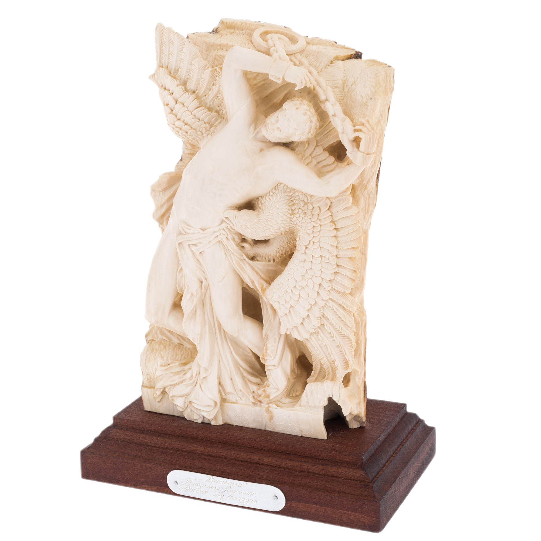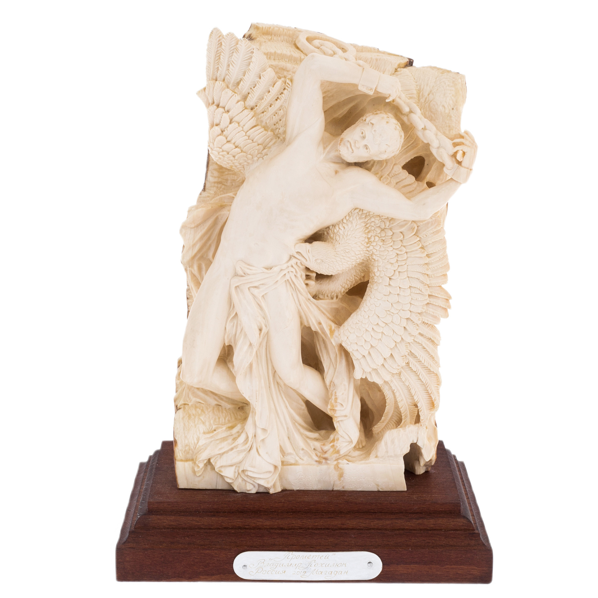 The ancient tusk, which has lain in permafrost for thousands of years, has preserved the power of nature and the energy of the epochs. The artist breathed life into it, exposing the iridescent texture, making fluid flesh out of hard bone, and a spirit—breathing design out of unyielding matter. The curves of Prometheus' body, his face distorted by suffering, the sharp feathers of the eagle's outstretched wings aimed at the titan's naked chest — all this is permeated with movement, tension of the moment, in which pain, pride and immortality are intertwined.