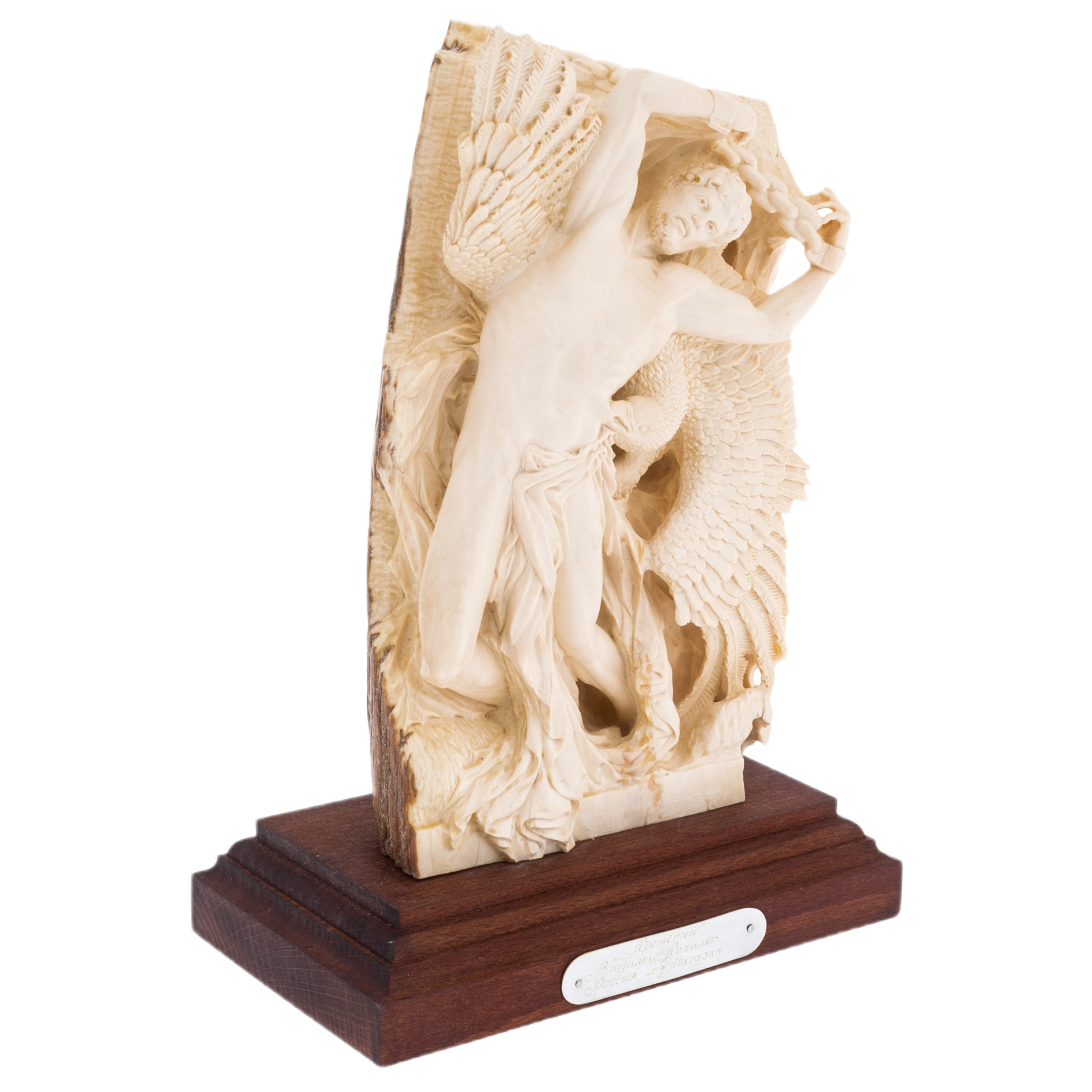 The sculpture, which captures the greatest act of sacrifice, captivates the eye and subdues the space. Carved from an eternal, like the legend itself, material — an ancient mammoth tusk, this image of Prometheus reminds of the price paid for progress, of the courage that lifts man above the gods. The interweaving of muscles, the curve of a tense arm clutching a broken chain—every movement is riddled with pain and grandeur, every moment is timeless.