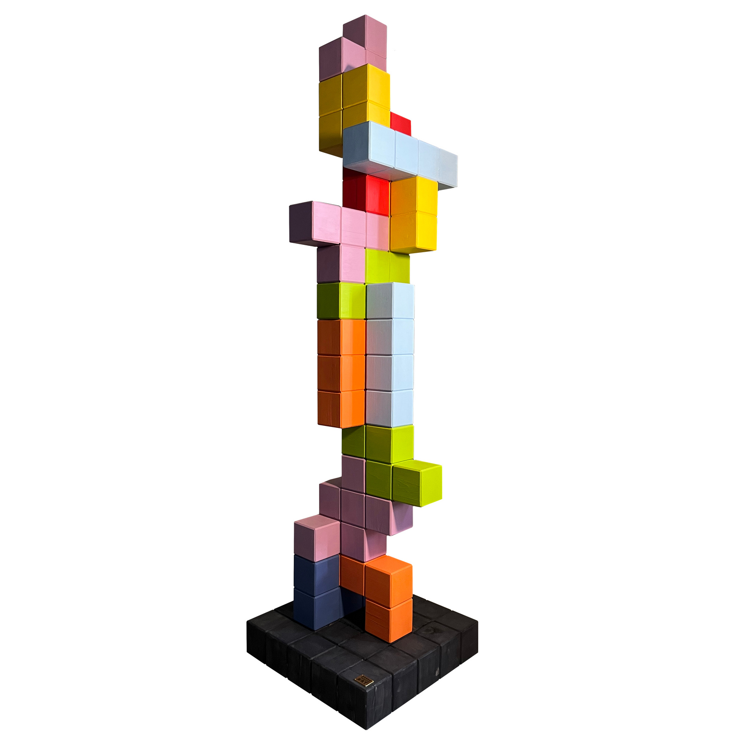 Скульптура «Тетрис» — арт-объект, собранный из ярких деревянных блоков, выкрашенных в сочные цвета и выстроенных в вертикальную конструкцию, напоминающую силуэт человека. Каждый элемент здесь — как жизненный опыт: разноцветный, разной формы, неожиданный, и в то же время необходимый, чтобы сложить нечто целостное. Работа выполнена вручную из дерева и закреплена на монолитном основании из черных кубов — символе устойчивости и внутреннего стержня.