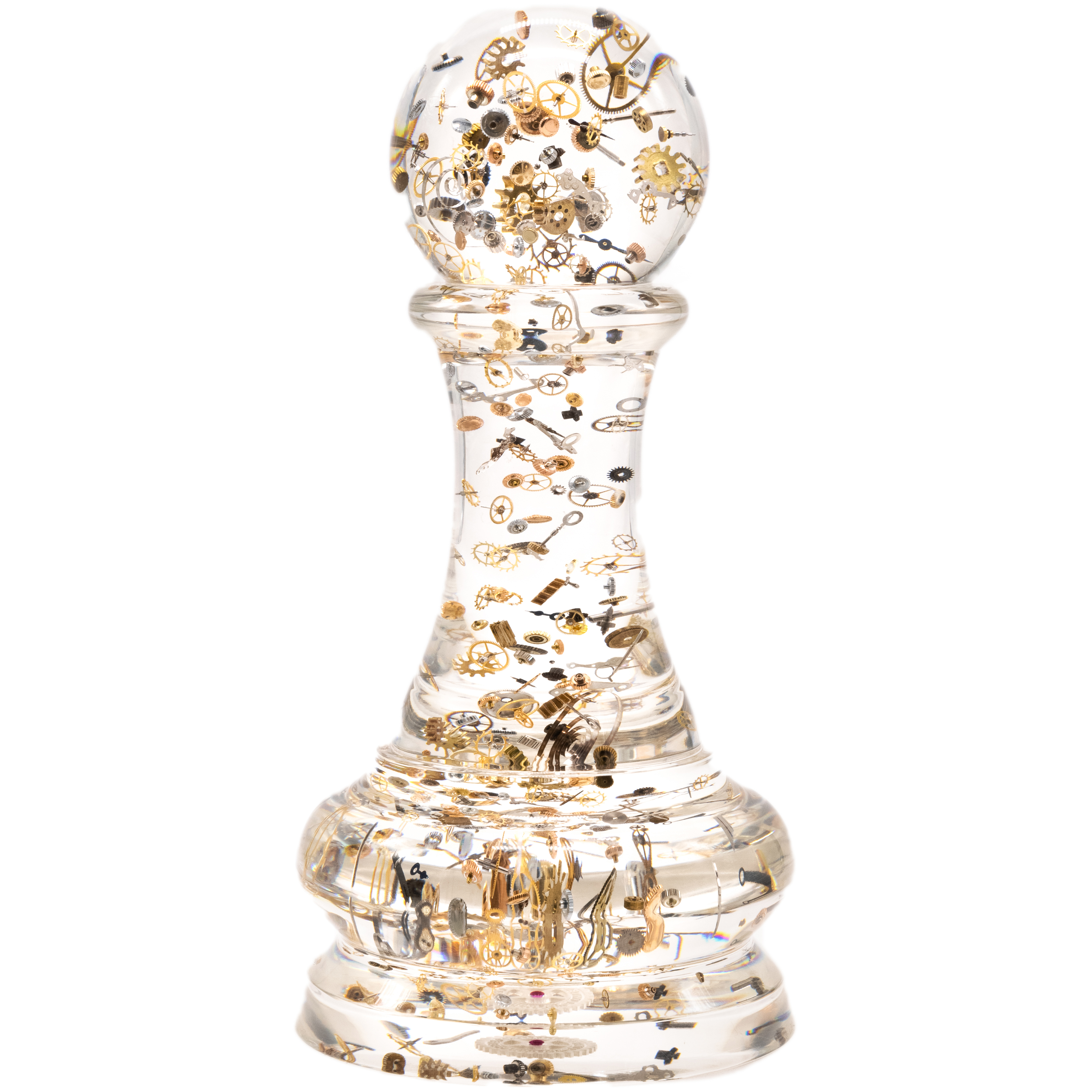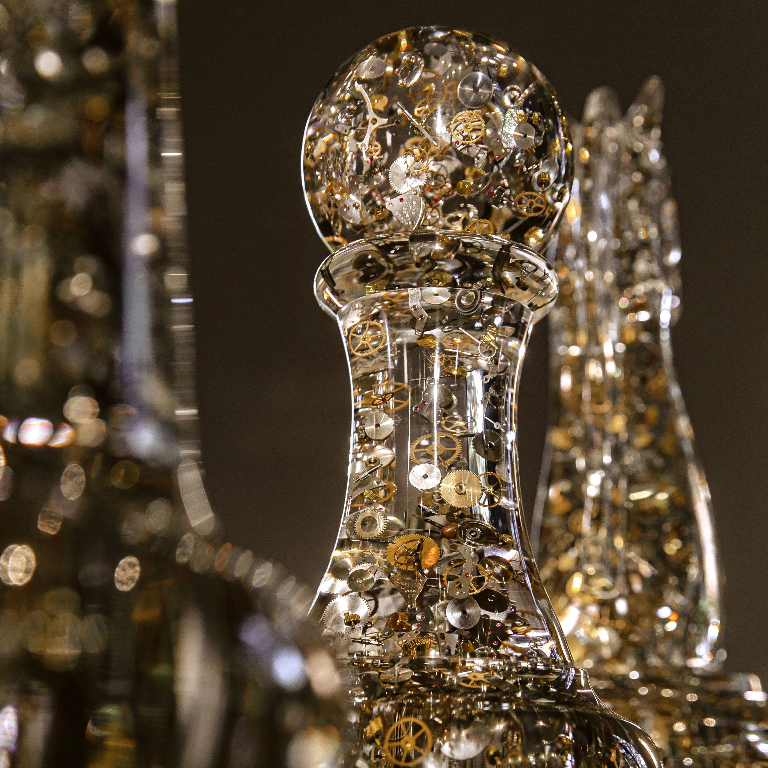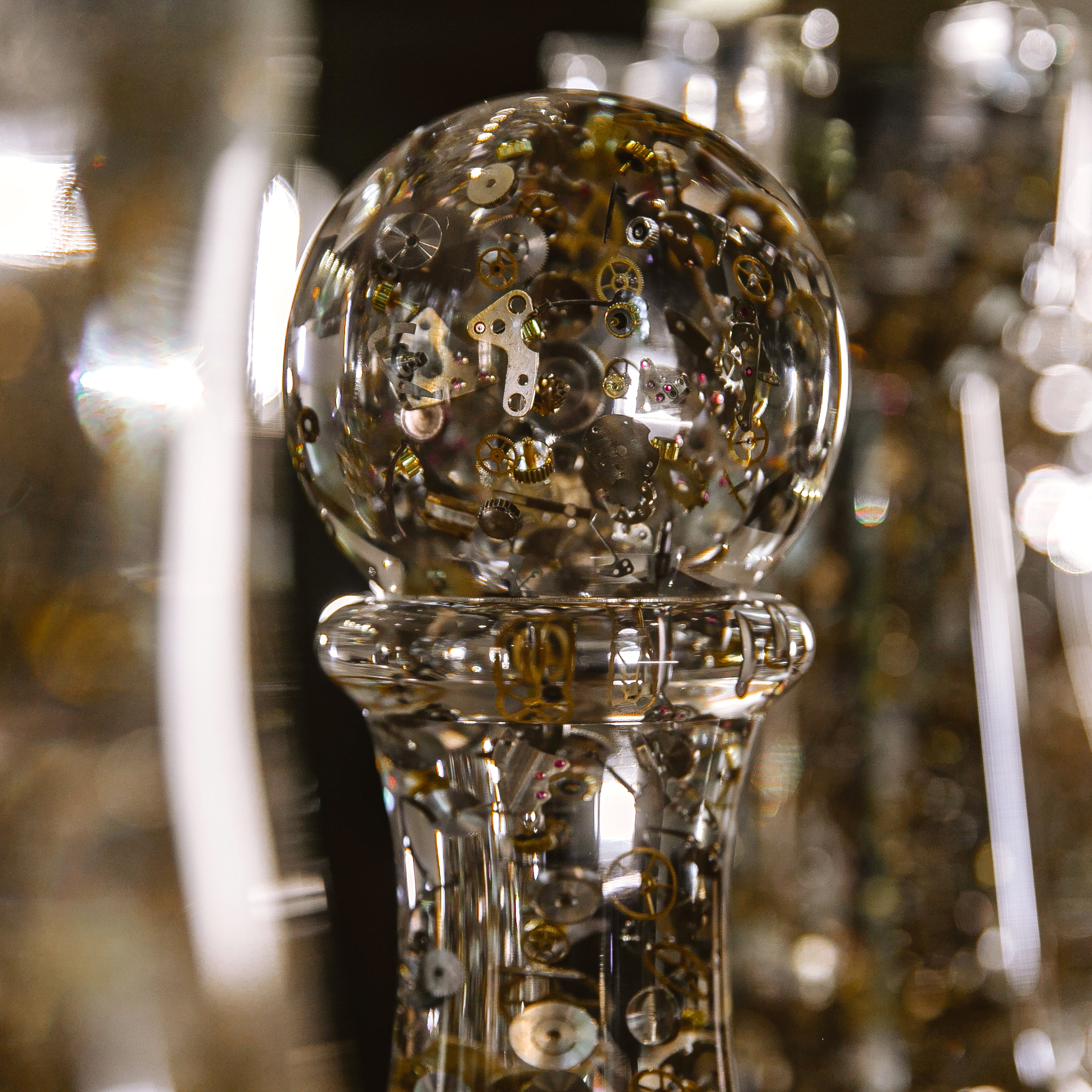Materials: impact-resistant Lucite® resin, watch movement parts.