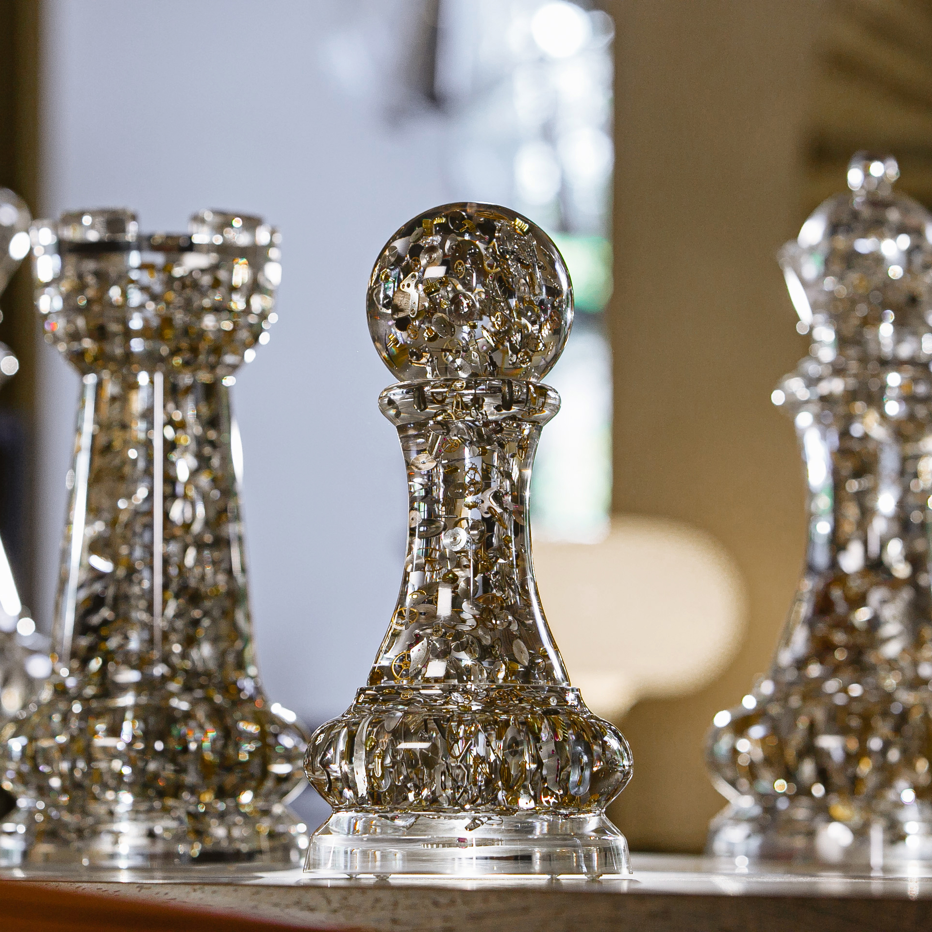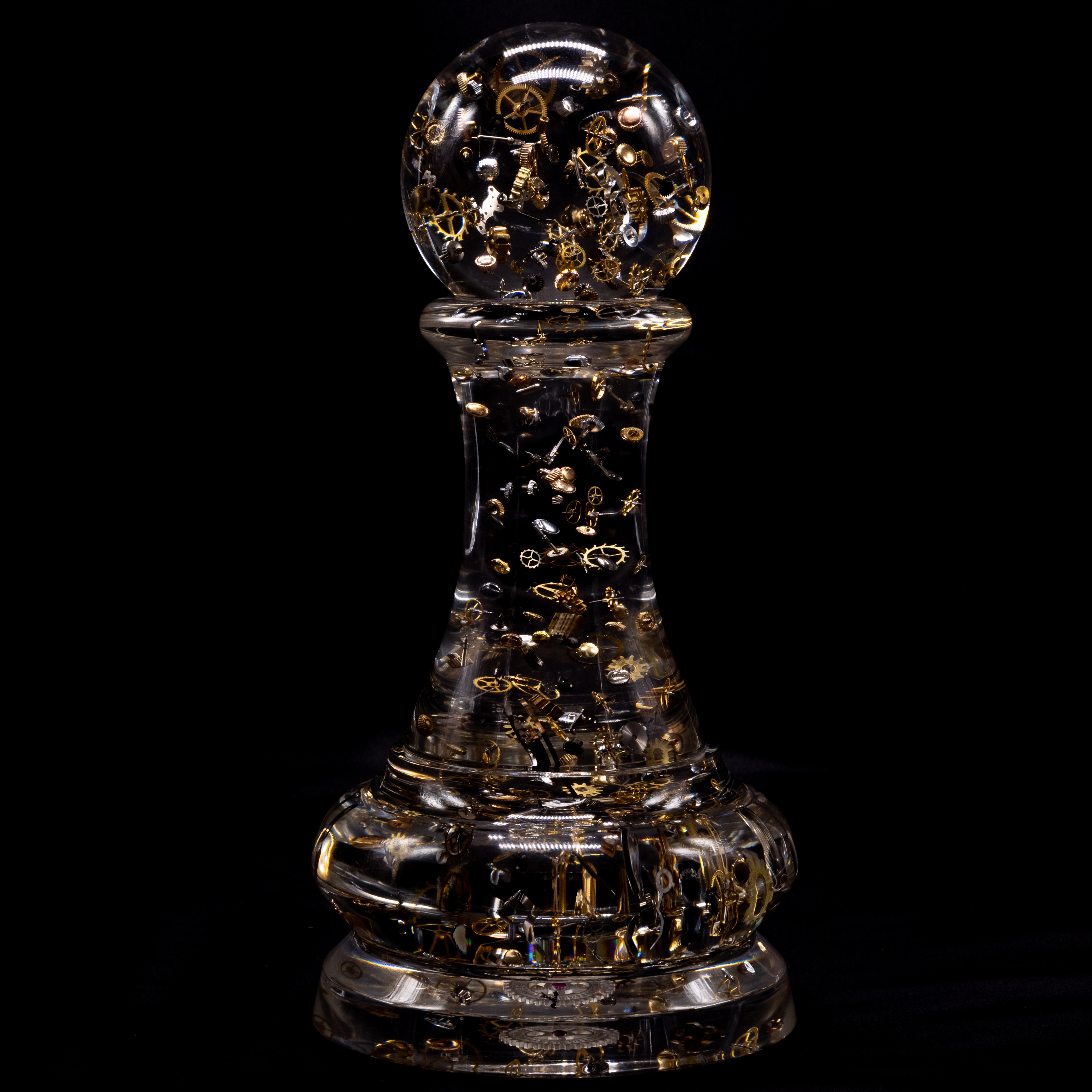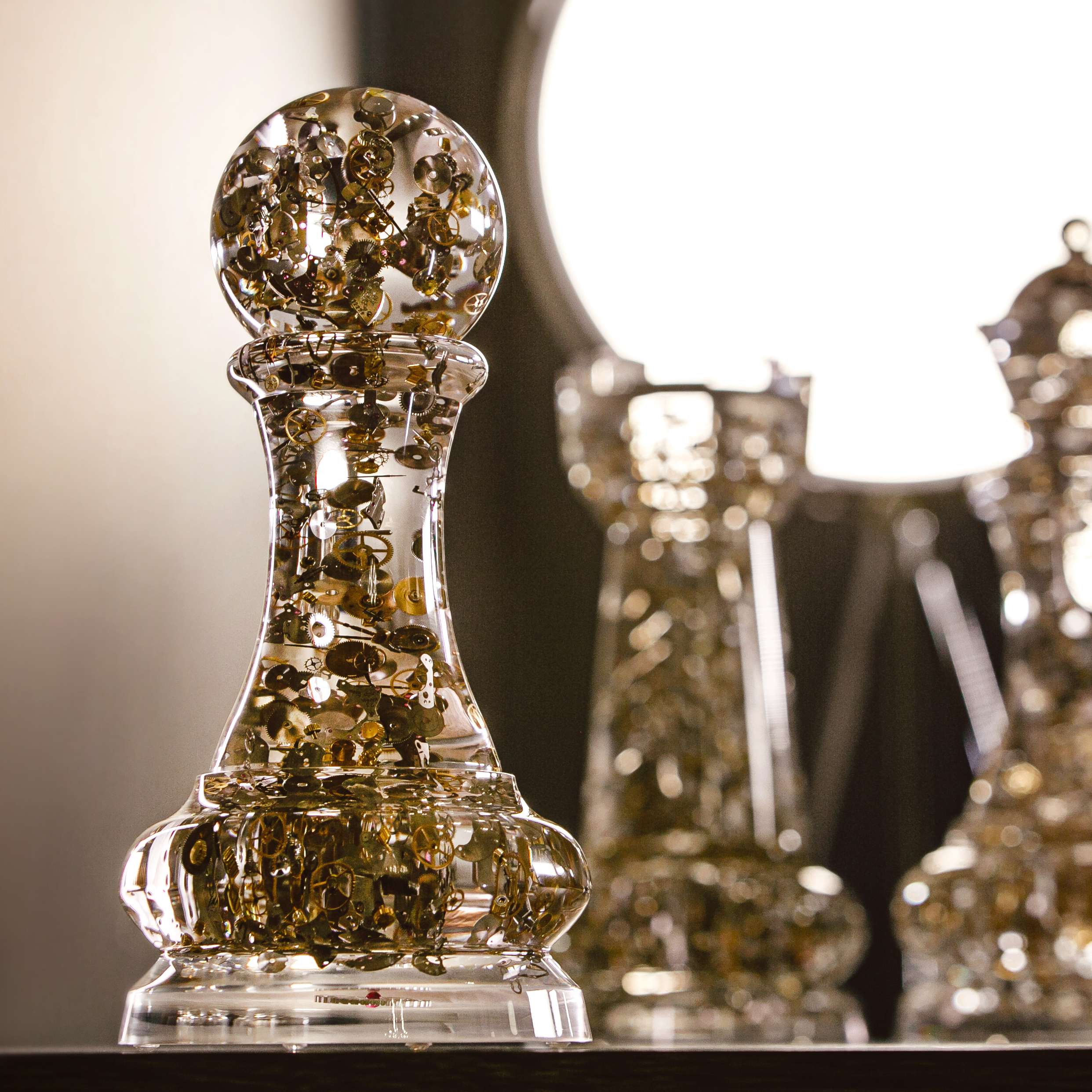 Materials: impact-resistant Lucite® resin, watch movement parts.